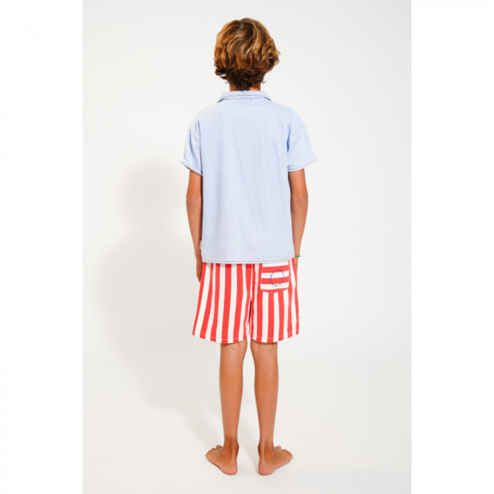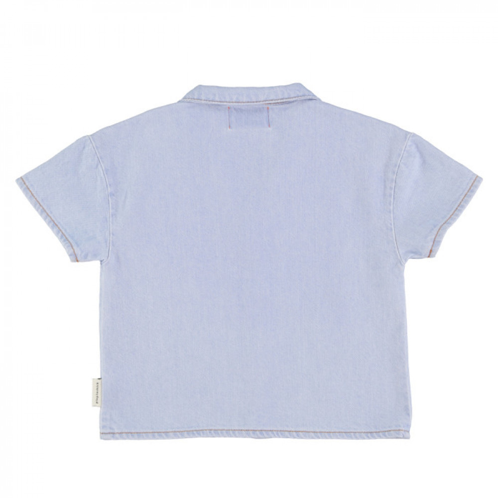Hawaiian in soft denim with a loose fit & open collar. Wood front buttons. Light blue denim.