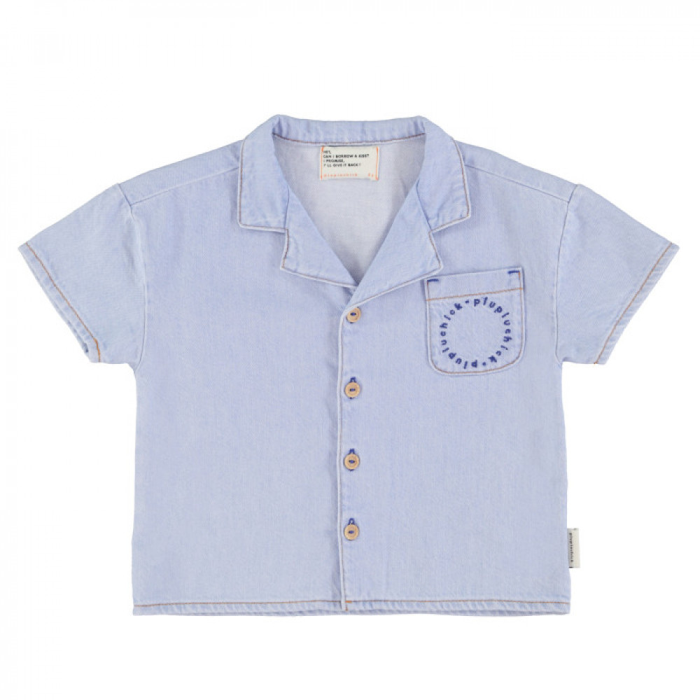 Hawaiian in soft denim with a loose fit & open collar. Wood front buttons. Light blue denim.