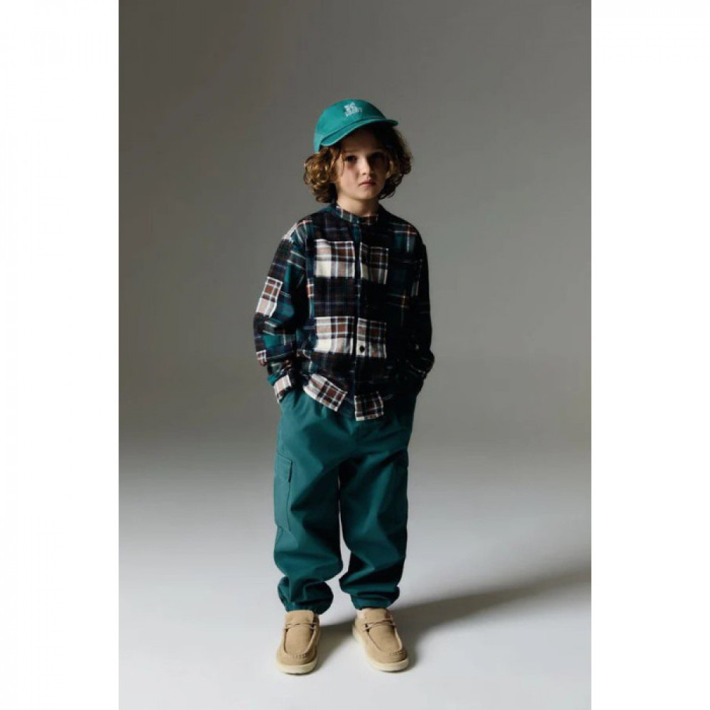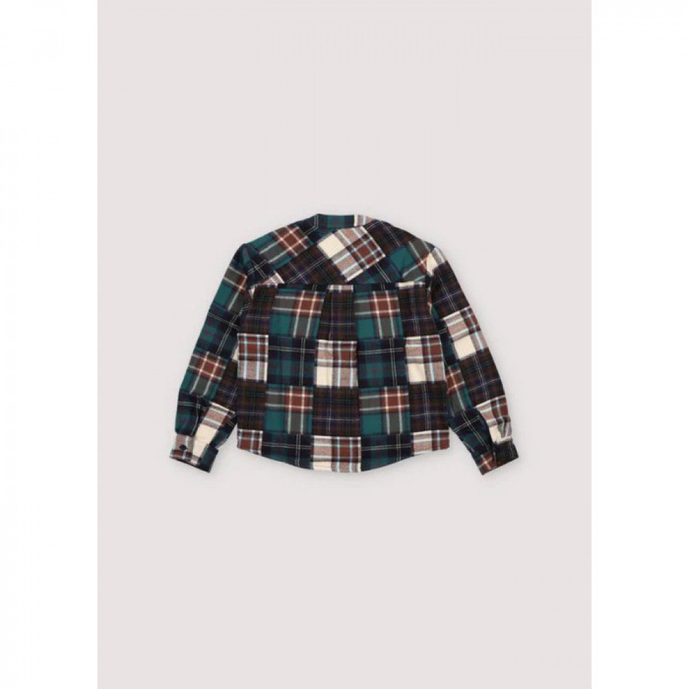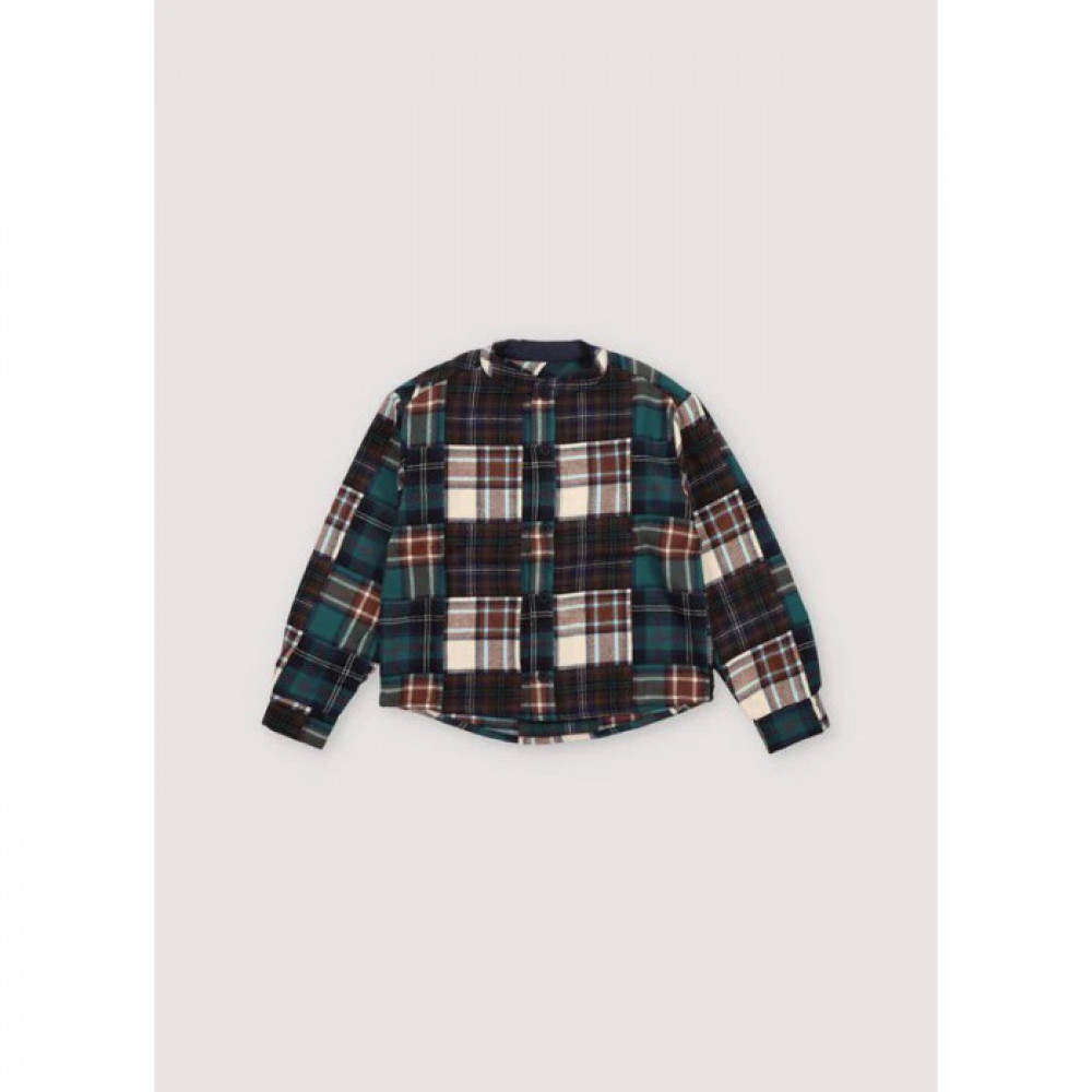 Kilimanjaro shirt with navy button, featuring a mandarin collar and square pockets on both sides of the placket. This garment stands out for its striking Teal Madras Patchwork print, adding a distinctive and modern touch to the ensemble.