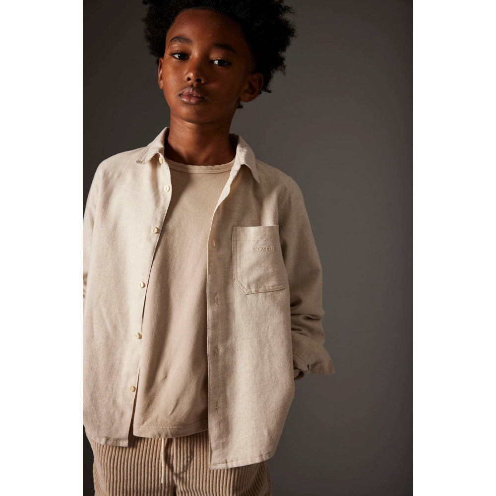 This boys’ shirt is made from cotton flannel with a mélange effect, crafted from 100% sustainable cotton. It features a classic collar, a button-down front placket, and a chest patch pocket embroidered with the “Cozmo” logo. Made from cotton certified by the Better Cotton Initiative. Offers a unique, handcrafted look. A sustainable choice for your boy’s wardrobe.