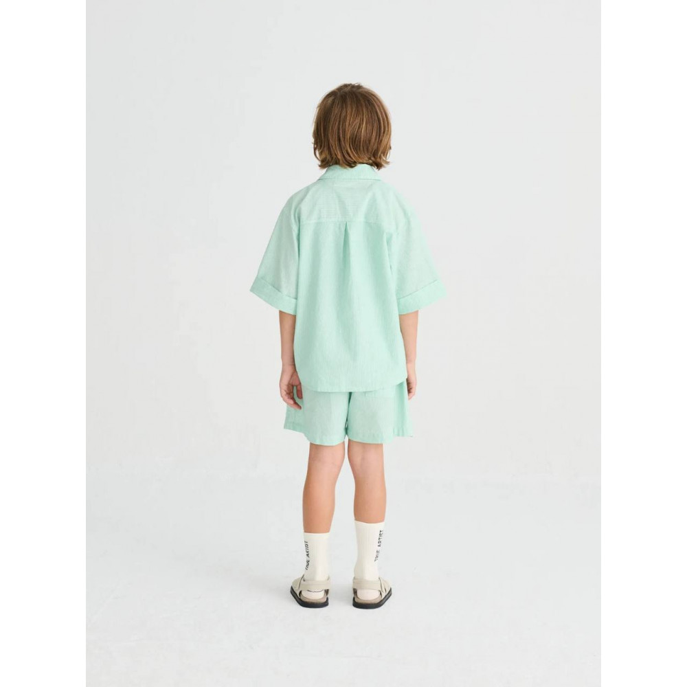 Shirt nº06 in Jade Green is made of 100% yarn dyed cotton fabric. This striped shirt is is designed with a spread collar, short sleeves and front button fastening and has our seasonal TA logo embroidered in contrast color on the chest pocket. It has a relaxed fit. Made in Spain.