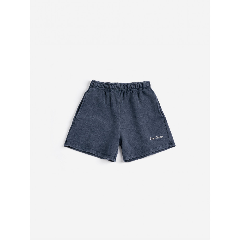 Navy blue shorts. Designed with elasticated waistband, embroidery, adjustable drawstring, over knee length, patch pocket, seam pocket and relaxed fit. Made in Spain.