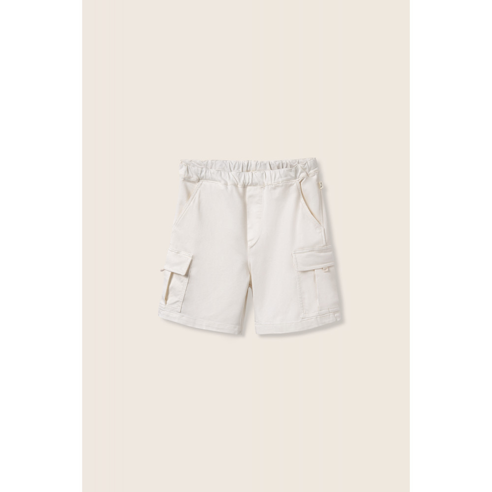 Bermuda shorts in comfy and elastic cotton twill. Elastic adjustable waistband. Mock fly. Side pockets and cargo pockets on the legs.