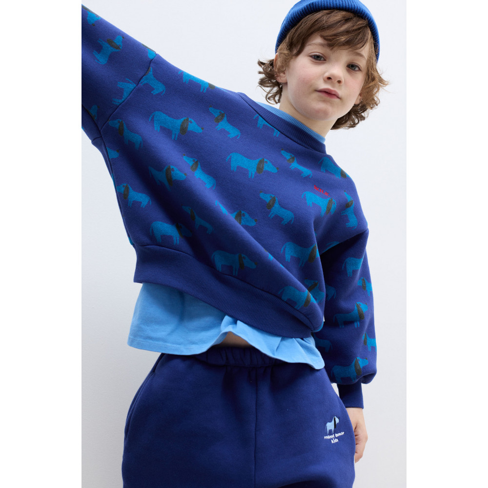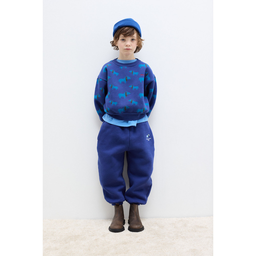 Vibrant and cozy, this bright blue sweatshirt features a playful dog print and a striking red embroidered logo on the chest. Made from soft organic cotton, it’s perfect for everyday wear with a fun, bold touch.