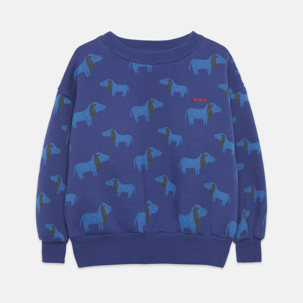 Vibrant and cozy, this bright blue sweatshirt features a playful dog print and a striking red embroidered logo on the chest. Made from soft organic cotton, it’s perfect for everyday wear with a fun, bold touch.
