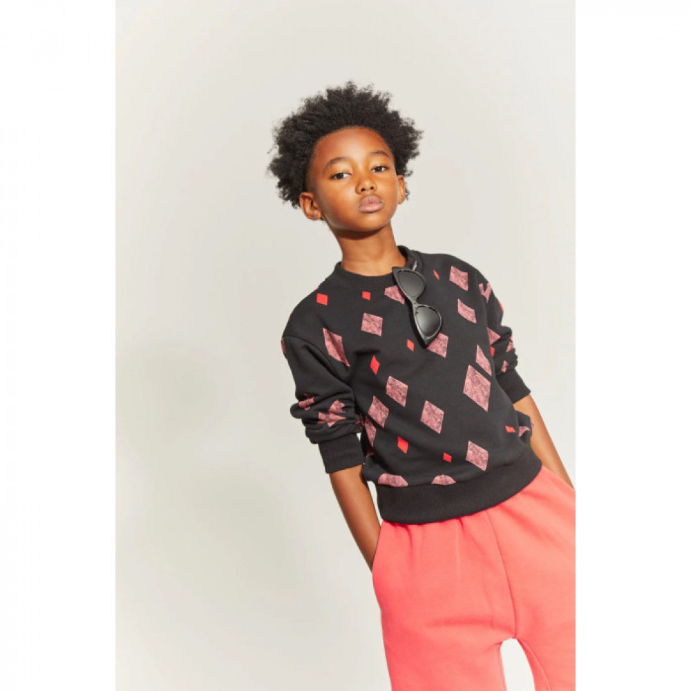 Delightful array of pink-hued and red diamonds on a black background. Combines a playful modern twist with a hint of vintage charm, exuding a fun and stylish appeal that merges the nostalgic with the contemporary. A perfect blend of comfort and whimsy. Details include fitted wrist cuffs, below-the-waist straight cut. This sweater is perfect for layering.