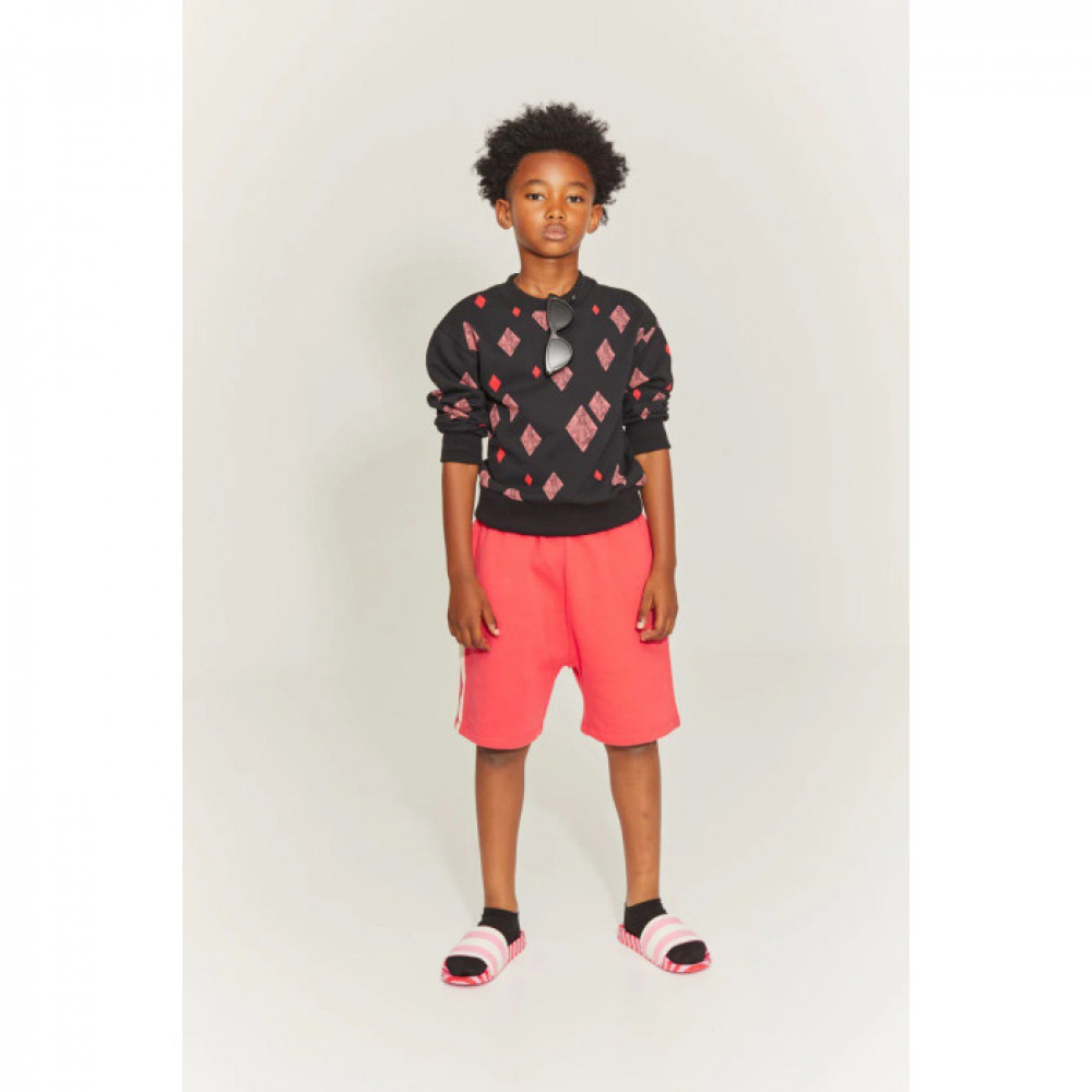 Delightful array of pink-hued and red diamonds on a black background. Combines a playful modern twist with a hint of vintage charm, exuding a fun and stylish appeal that merges the nostalgic with the contemporary. A perfect blend of comfort and whimsy. Details include fitted wrist cuffs, below-the-waist straight cut. This sweater is perfect for layering.