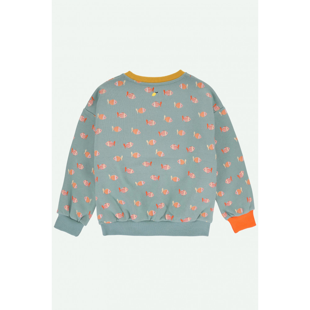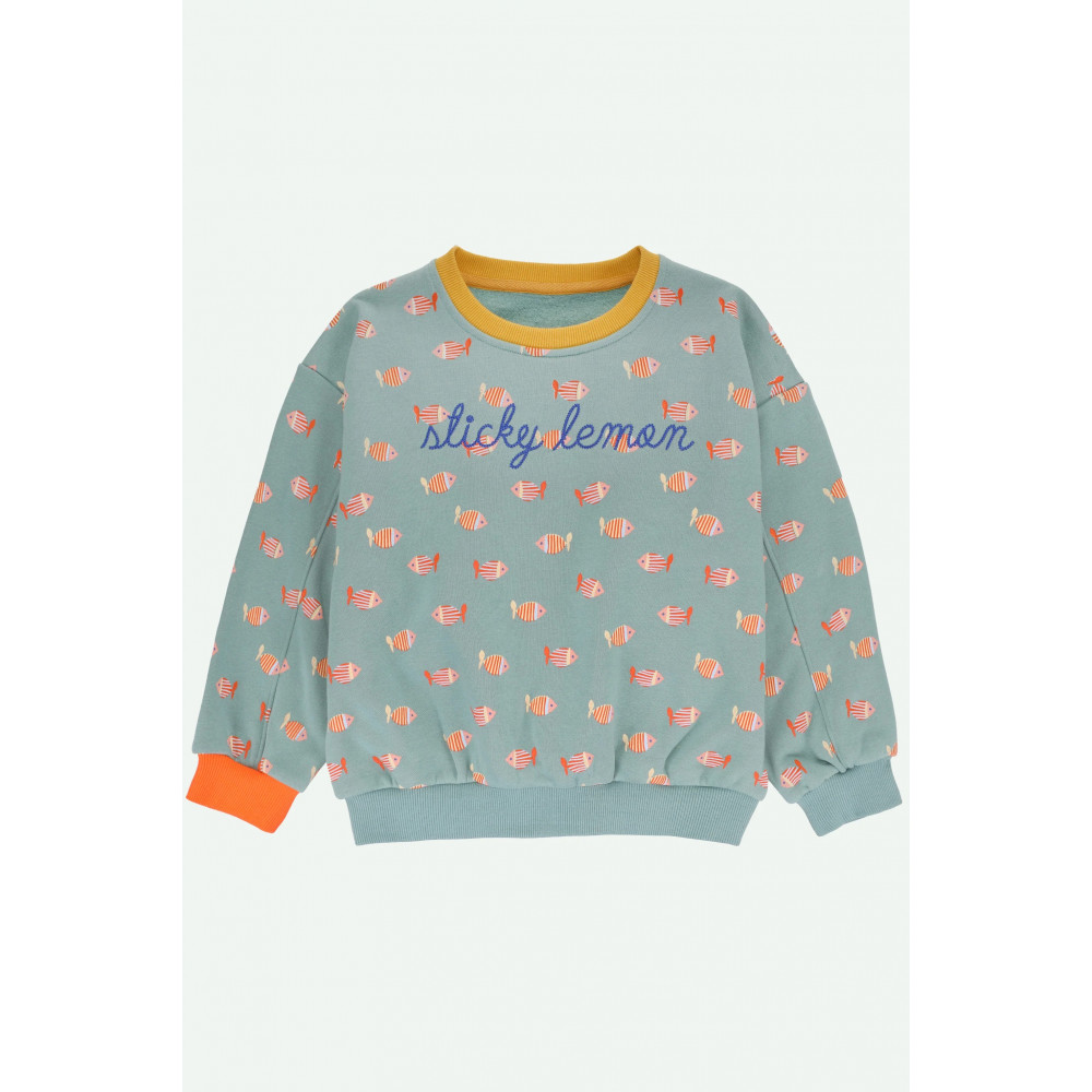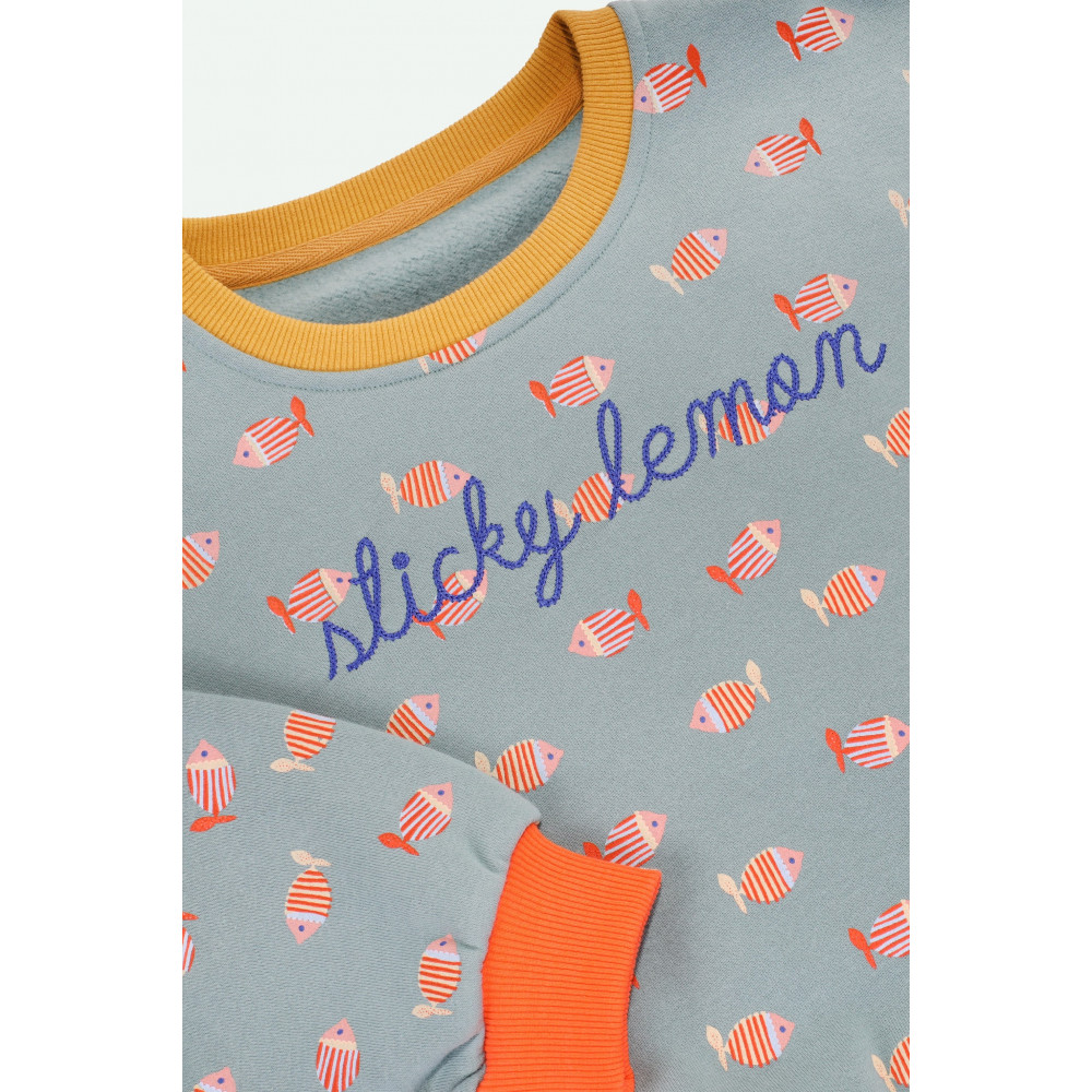 Dive all the way into the wonders of the deep sea with this sweater. There is no piece of it that is not covered in fish! On the front you will find a cool embroidery and our logo is embroidered on the back. One sleeve has a playful orange cuff. – loose fit – round neck – dropped shoulders – long puff sleeves – ribbed cuffs