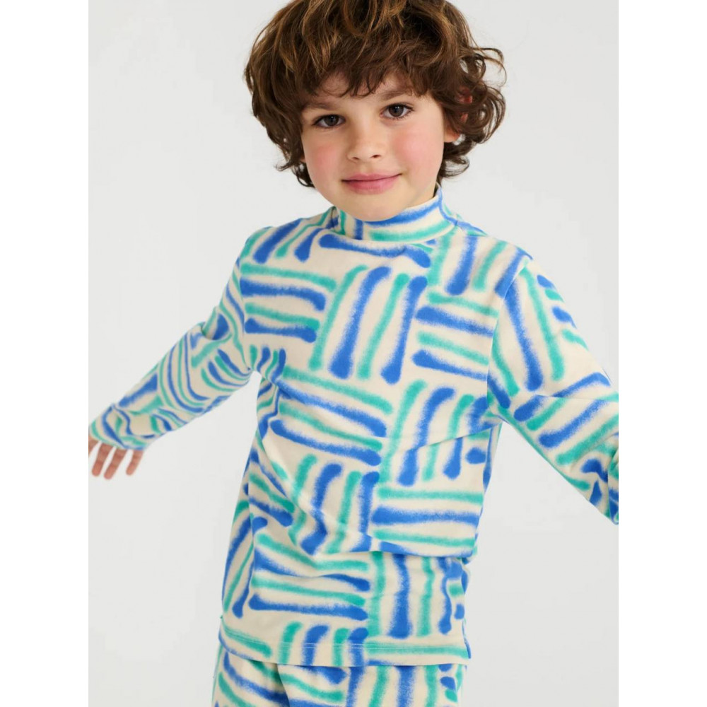 Aerosol Turtleneck T-shirt is made of 91% organic cotton, 9% elastane and it features an artistic allover hand painted print. This turtle neck t-shirt has a small embroidery of our bird logo on the sleeve in navy color. It has a straight fit. Made in Spain.