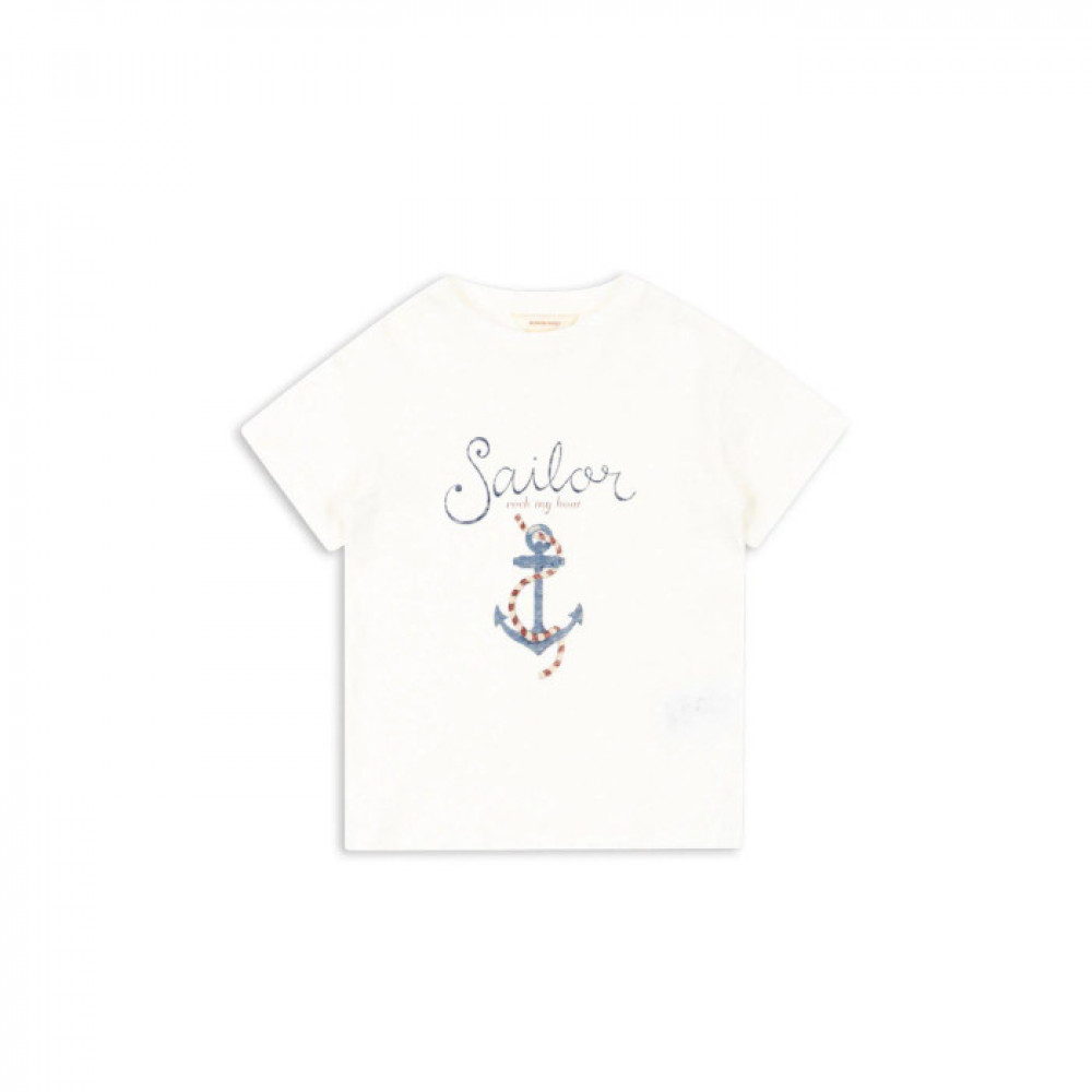 Linen blend tee with a soft texture. Classic design with short sleeves and crewneck. Snap button opening on shoulder for sizes up to 18 months for easy dressing.