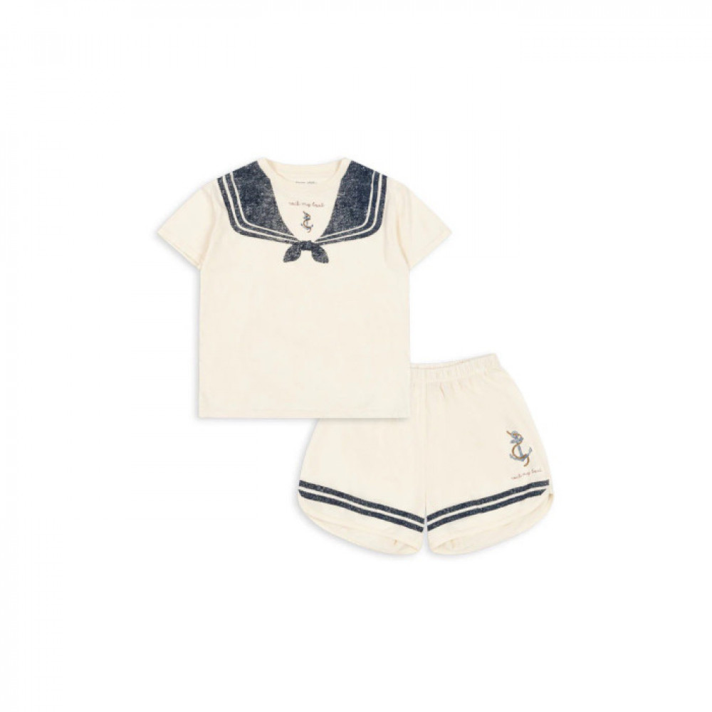 Two-piece cotton set with a matching tee and shorts. The tee features snap buttons on the left shoulder up to 18 months for easier dressing.