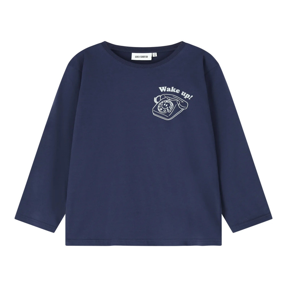 Add a splash of fun to their wardrobe with this maritime blue kids' longsleeve, featuring a playful "Wake Up" quote paired with a vintage-style telephone print. Made for dreamers and doers, with cozy comfort for busy days.