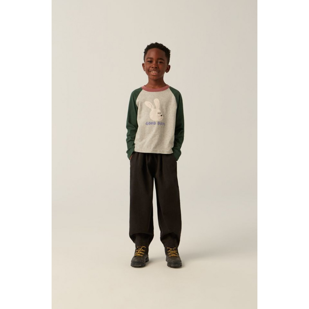 With an oversized fit and color block sleeves, this t-shirt features a print of a bunny having a good day. With long sleeves and rounded neck it is the perfect garment to wear all winter. Tshirt with long sleeves and oversized fit. Rounded neck with rib quality for added comfort. Jersey 100% organic cotton GOTS. Made in Portugal.