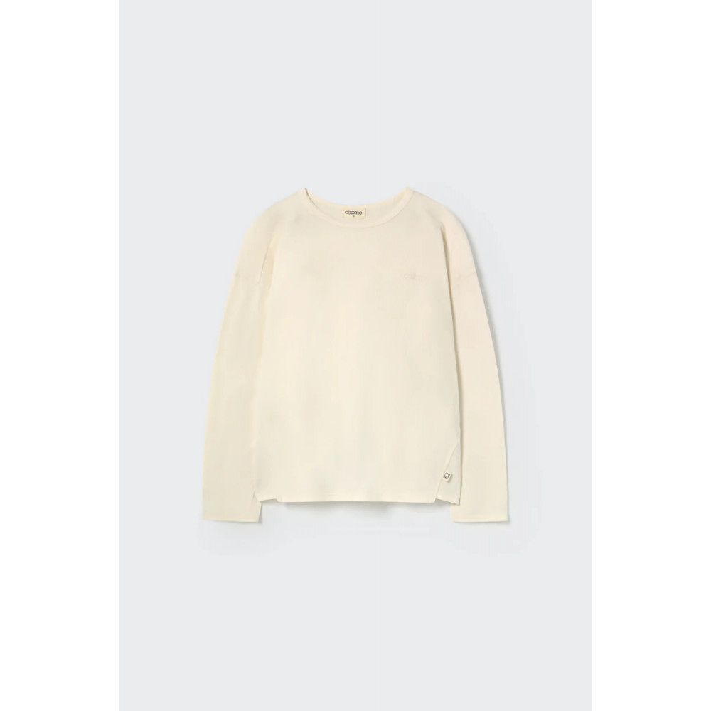 Kids' T-shirt made from toasty organic cotton jersey with a soft brushed finish. It features a round neckline, dropped shoulders, and long sleeves. The sides have triangle inserts, and ‘Cozmo’ is embroidered on the chest for a subtle accent. Designed for kids, comfortable and easy to wear. Made from organic cotton, sustainably grown and ethically sourced. Brushed finish provides an incredibly soft, cozy layer. Warmth without bulk — perfect for layering. Gentle on the skin and the planet. A sustainable choice for your kid's wardrobe.