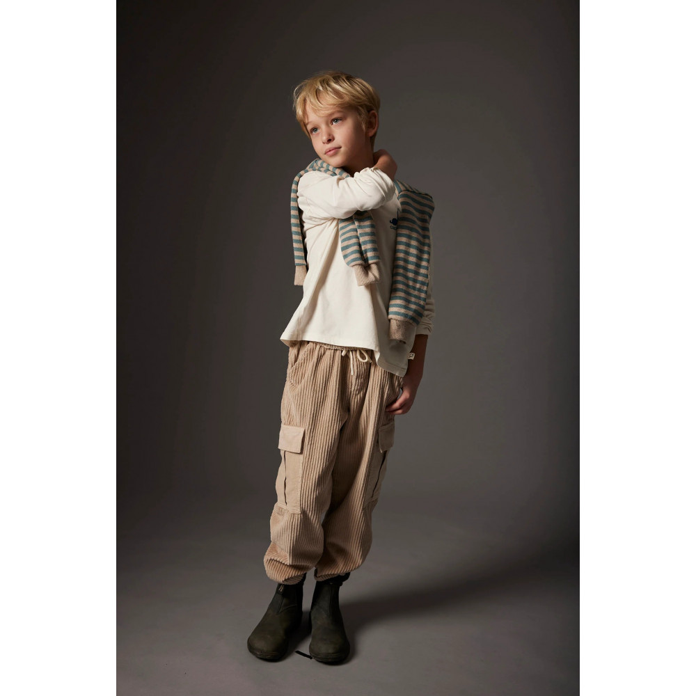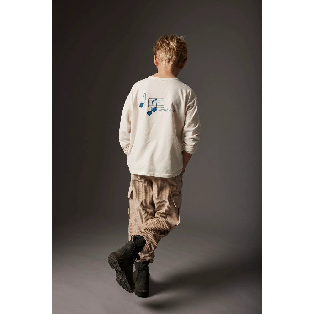 This T-shirt is part of our organic cotton boys’ clothes collection, crafted from toasty jersey fabric. It features a round neckline, dropped shoulders, and long sleeves. The front shows a printed musical note with "Cozmo" on the chest, while the back displays a staff with musical notes and the message "Cozmo Playlist." Triangle inserts at the sides add subtle detail. Brushed on the outside for a soft, comforting feel. Made from organic cotton, sustainably grown and ethically sourced. Brushed finish provides an incredibly soft, cozy layer. Warmth without bulk — perfect for layering. Gentle on the skin and the planet. A sustainable choice for your kid’s wardrobe.
