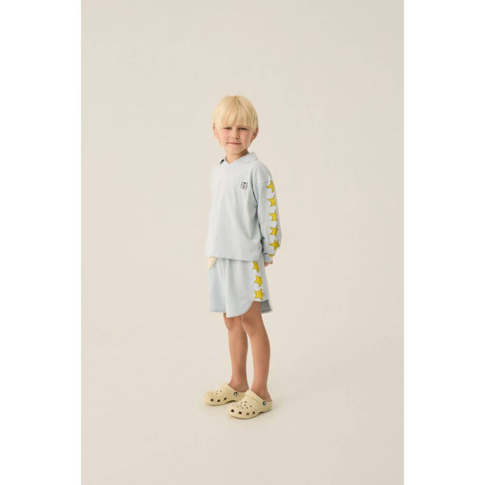 Retro vibes in this blue washed polo with star printed on the sleeves. With oversized fit and rib in cuffs for more comfort. It is a very versatile garment that close any summer outfit.