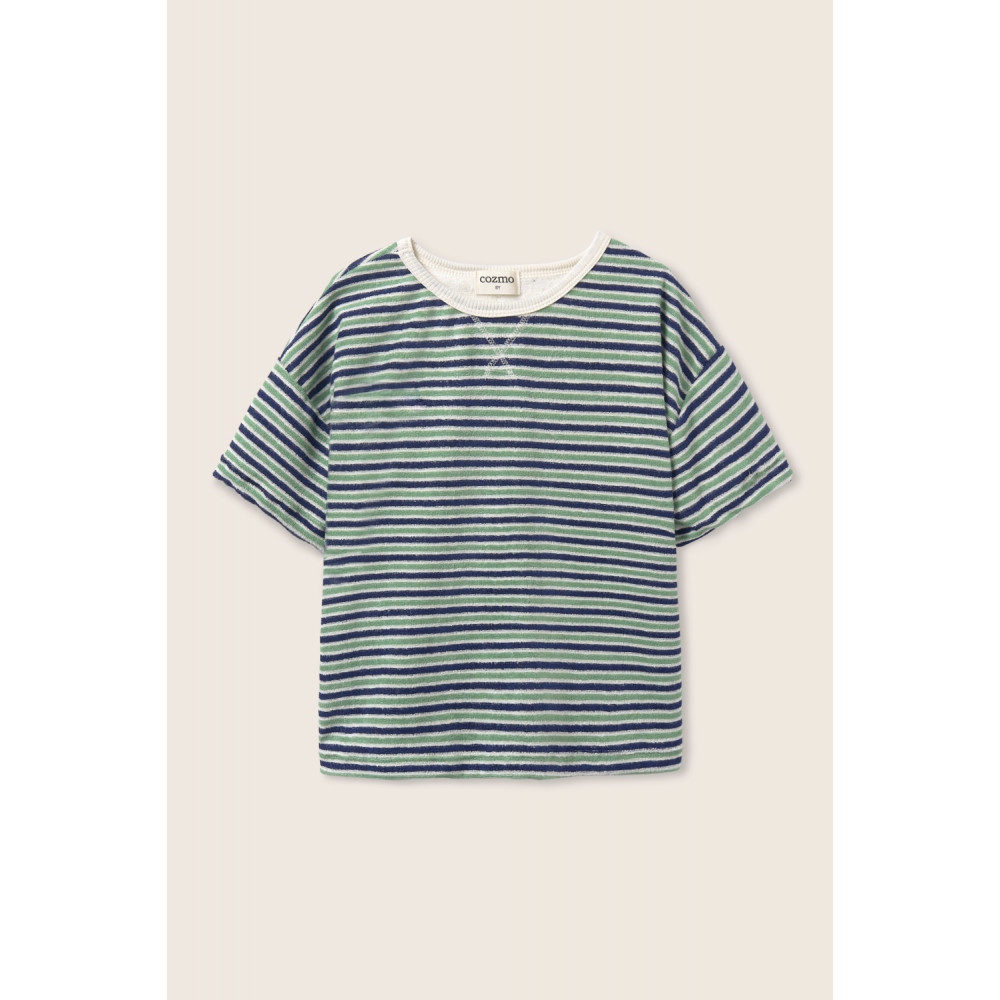 Striped T-shirt made of soft terry cloth. Ribbed round neckline with an embroidered X-shaped detail at the neck. Dropped shoulders and short sleeves. Rounded insert on the inside.
