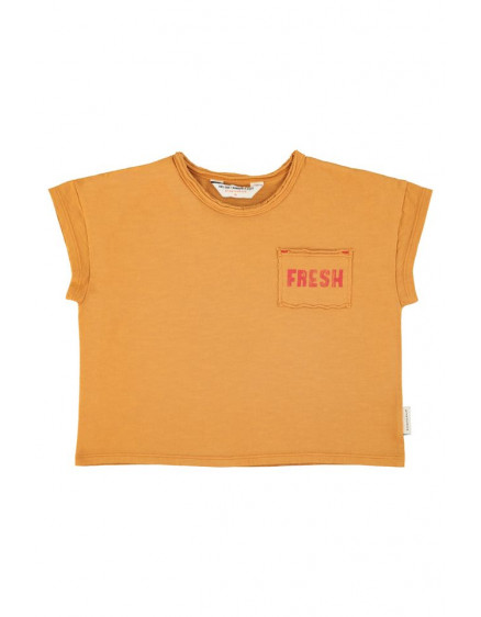 T´shirt in jersey flamé with chest pocket in raw edge. Detailed with print on the chest and back print. Wood buttons on shoulder for baby sizes. Wash cold (max 30ºC) . Do not bleach . Do not tumble dry . Iron cool (max 110ºC) . Do not dry clean