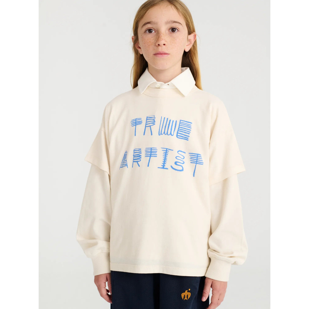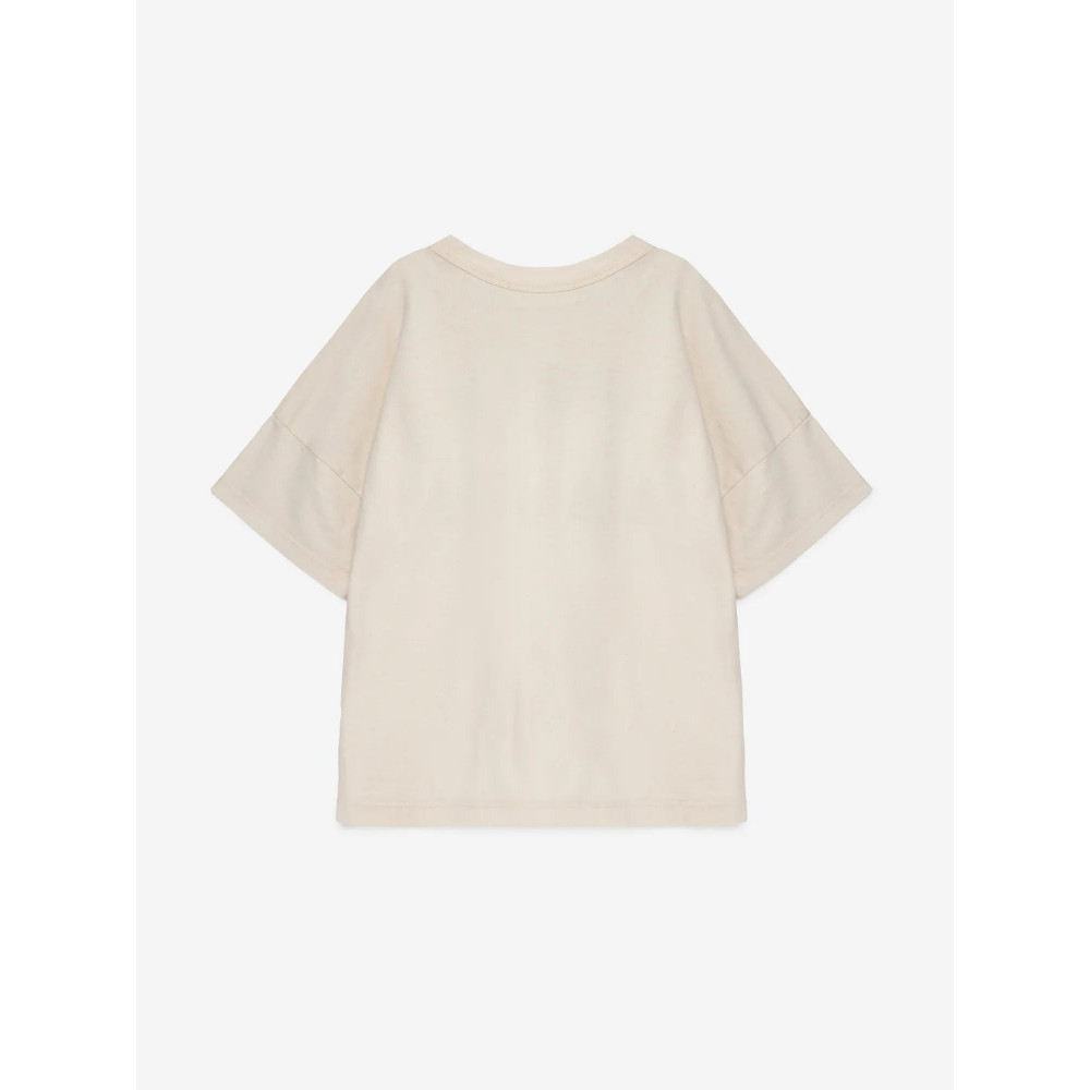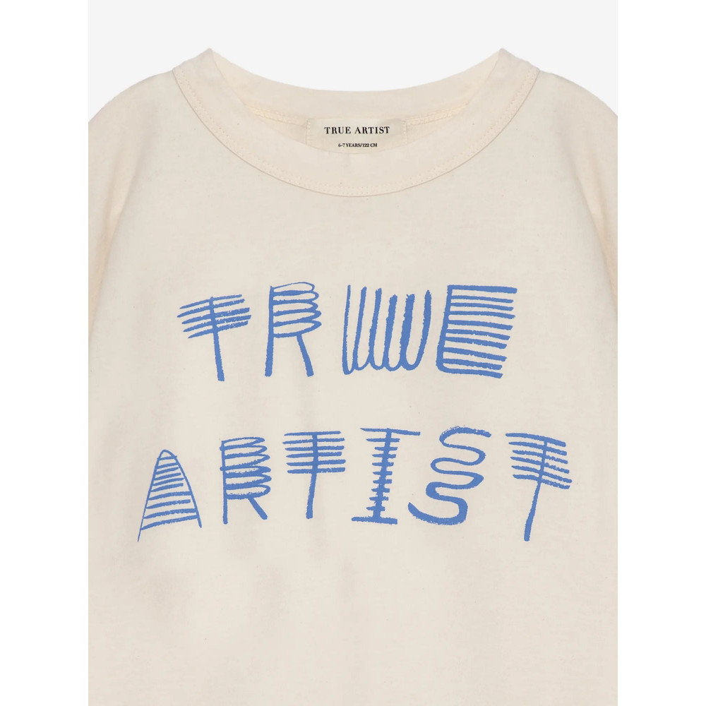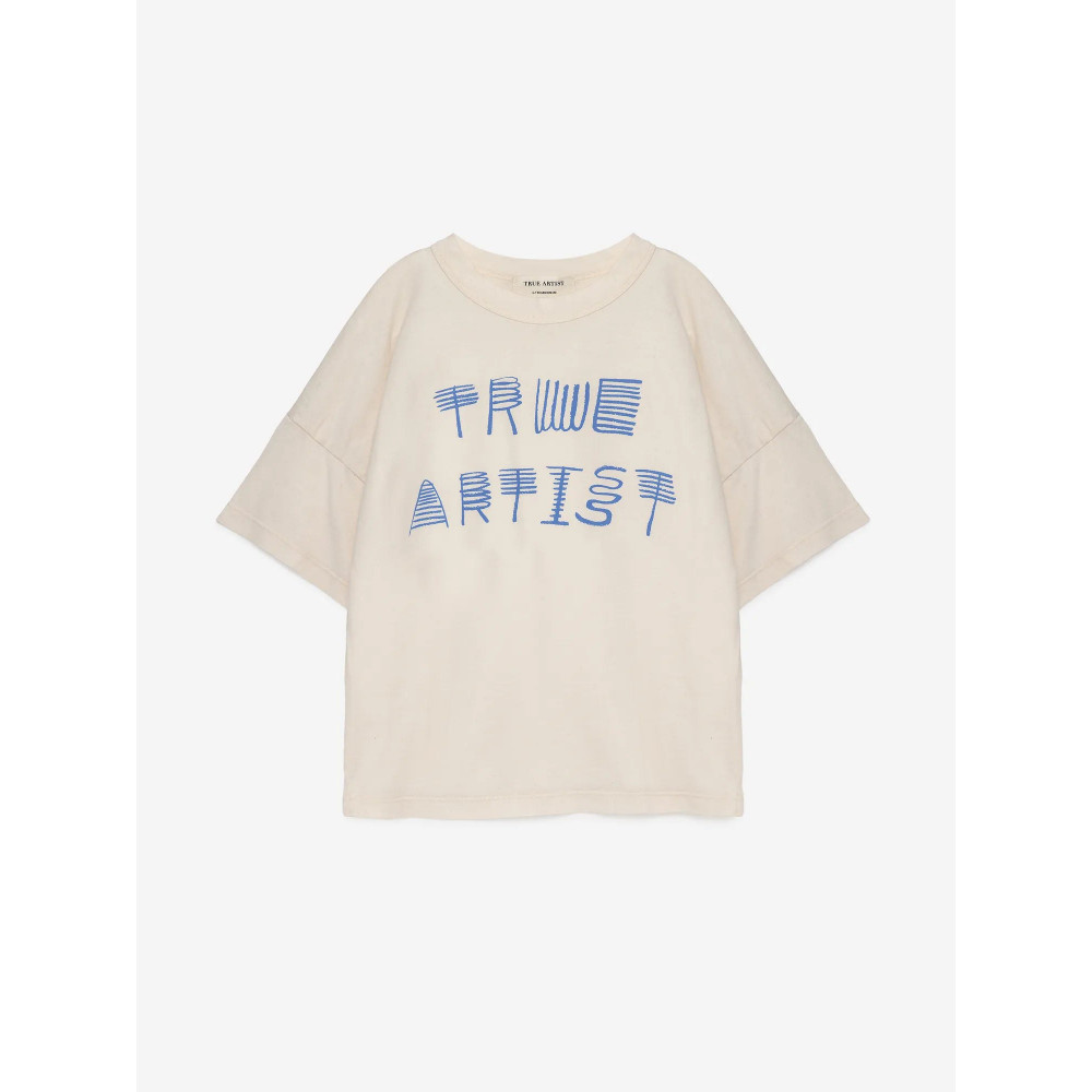T-shirt nº01 in Ivory White is made of 100% organic cotton and has a seasonal interpretation of True Artist print on the front. It is designed with dropped shoulders, round neck and short sleeves. It has a boxy fit. Made in Spain.