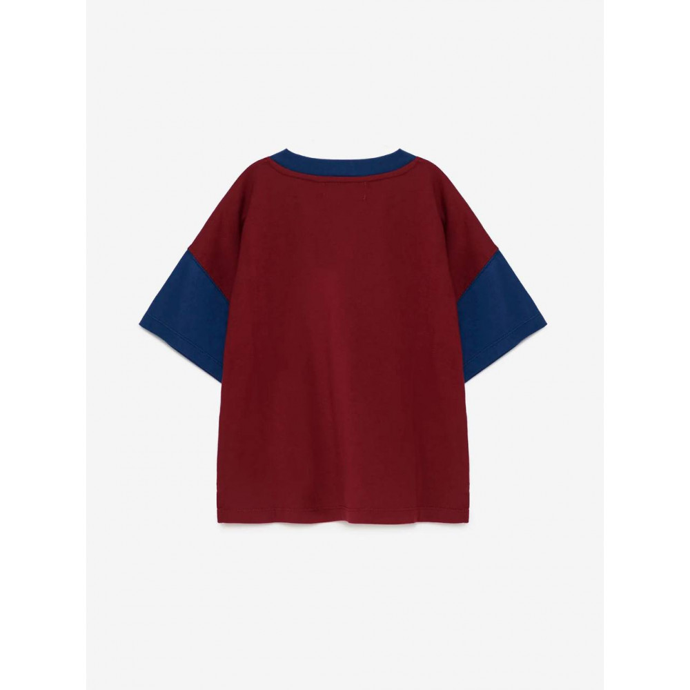 T-shirt nº18 in Burgundy Red is made of 100% organic cotton. This color block t-shirt is designed with sleeves and collar in contrast blue color and it features our brand slogan printed on the front. It has a regular fit. Made in Portugal.
