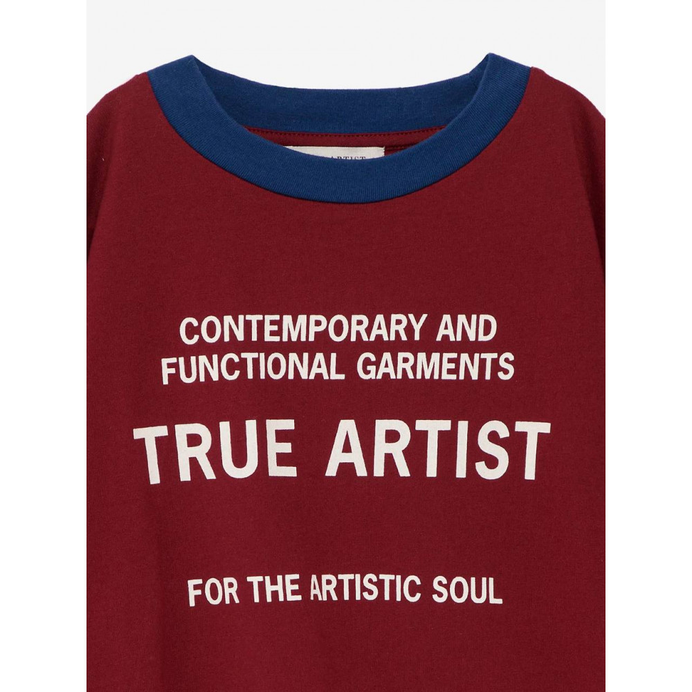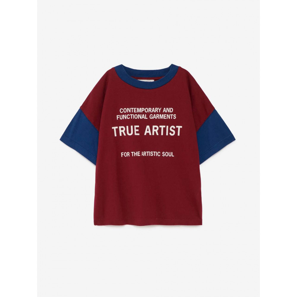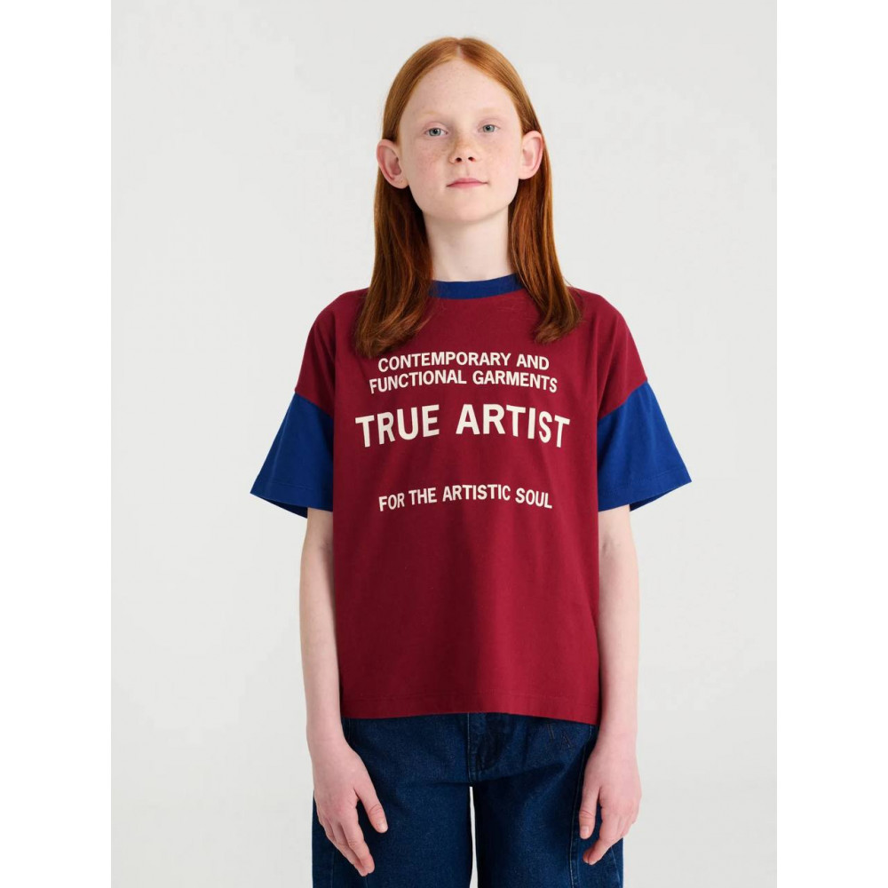 T-shirt nº18 in Burgundy Red is made of 100% organic cotton. This color block t-shirt is designed with sleeves and collar in contrast blue color and it features our brand slogan printed on the front. It has a regular fit. Made in Portugal.
