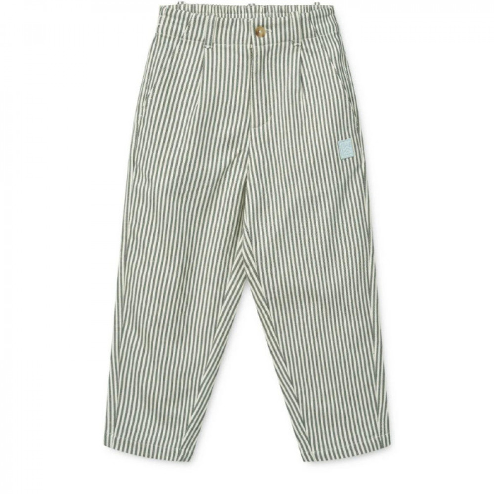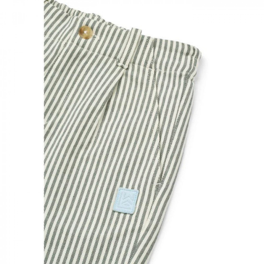 Dyed yarn fabric for long-lasting color Finishing details such as pleats, pockets and buckles Elastic waistband at the back for a comfortable fit