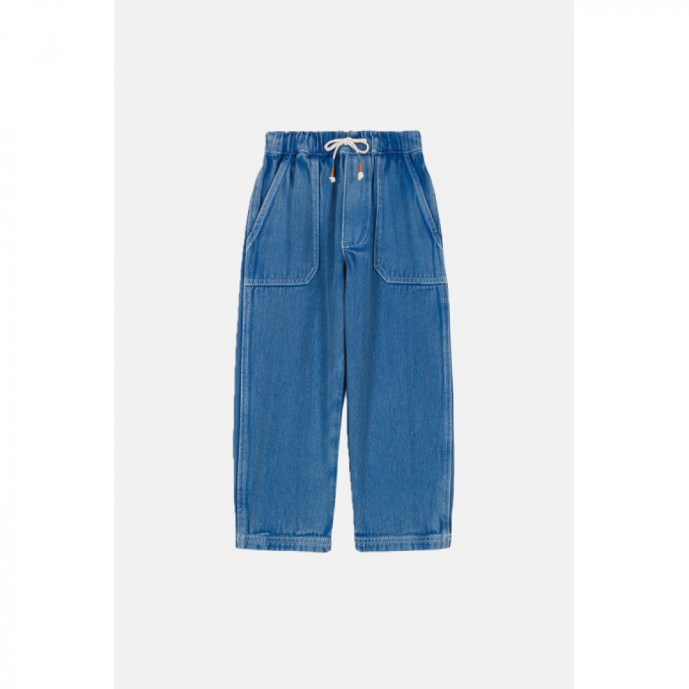 Straight-leg pants with elasticized waistband, in denim-style soft cotton fabric. Contrasted topstitching Two side patch pockets. Back patch pocket with "LM" woven label. Faux fly at front. Drawstring with embro dered signature detail. Please note: for sizes under fivears, no fitent pockets and no drawstring