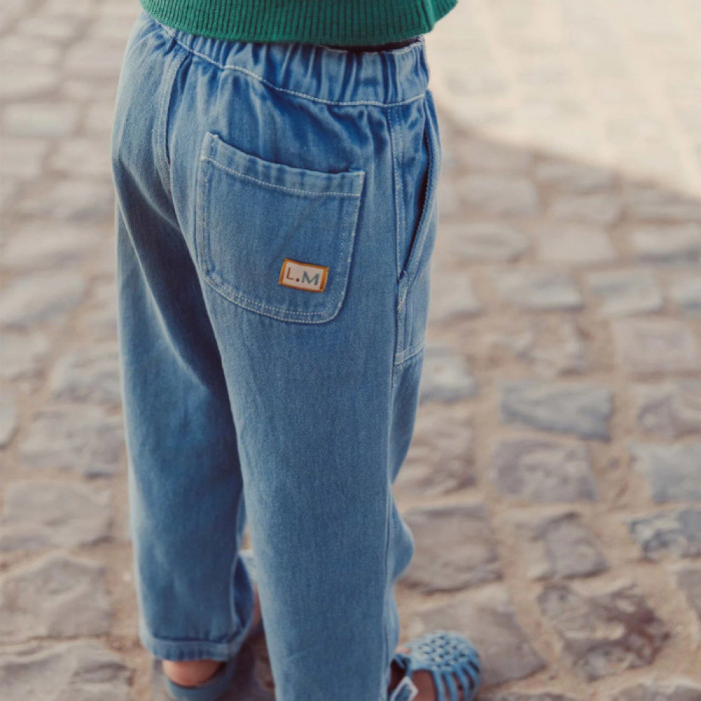 Straight-leg pants with elasticized waistband, in denim-style soft cotton fabric. Contrasted topstitching Two side patch pockets. Back patch pocket with "LM" woven label. Faux fly at front. Drawstring with embro dered signature detail. Please note: for sizes under fivears, no fitent pockets and no drawstring