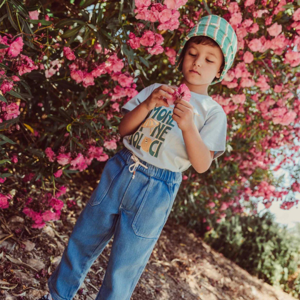 Straight-leg pants with elasticized waistband, in denim-style soft cotton fabric. Contrasted topstitching Two side patch pockets. Back patch pocket with "LM" woven label. Faux fly at front. Drawstring with embro dered signature detail. Please note: for sizes under fivears, no fitent pockets and no drawstring