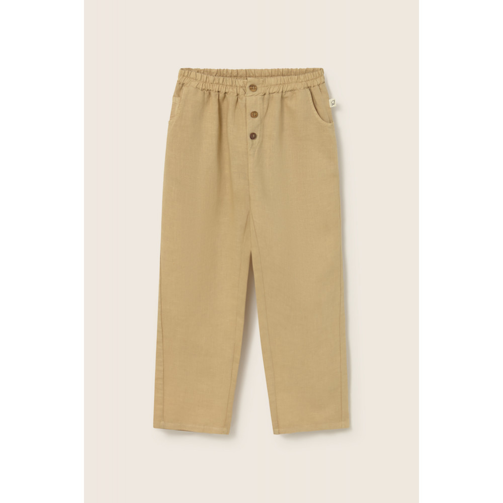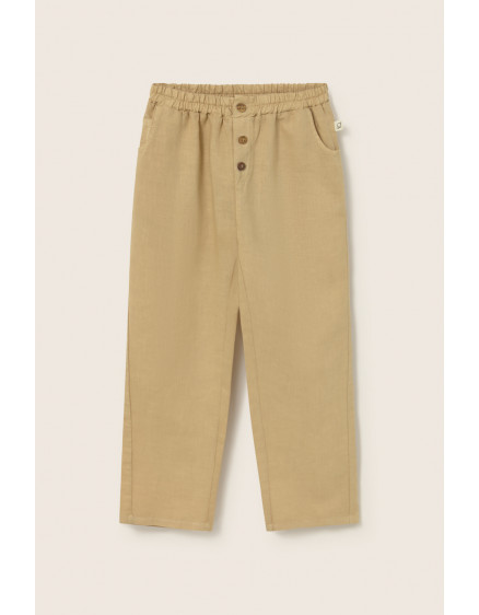 Pants made from a breathable cotton-linen blend. Elastic waistband. Decorative buttons and mock fly. Side pockets with one coin pocket. Patch pocket at the back. Slightly forward seams