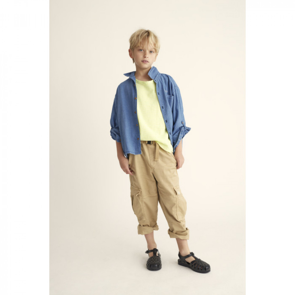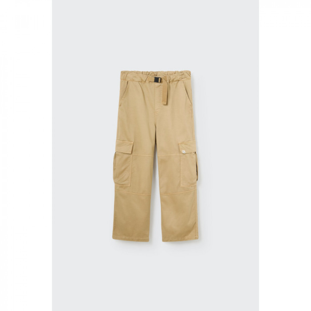 Cargo pants in smooth, lightweight, and stretchy twill cotton. Adjustable strap tie and mock fly. Tapered legs. Back yoke. Diagonal side pockets and two flap pockets at the legs. Contrasting lining details.