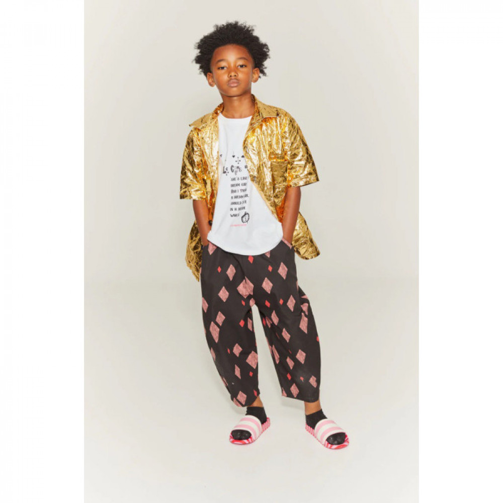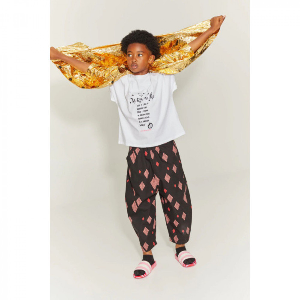 Delightful array of pink-hued and red diamonds on a black background. Combines a playful modern twist with a hint of vintage charm, exuding a fun and stylish appeal that merges the nostalgic with the contemporary. Elasticated waistband and side pockets.