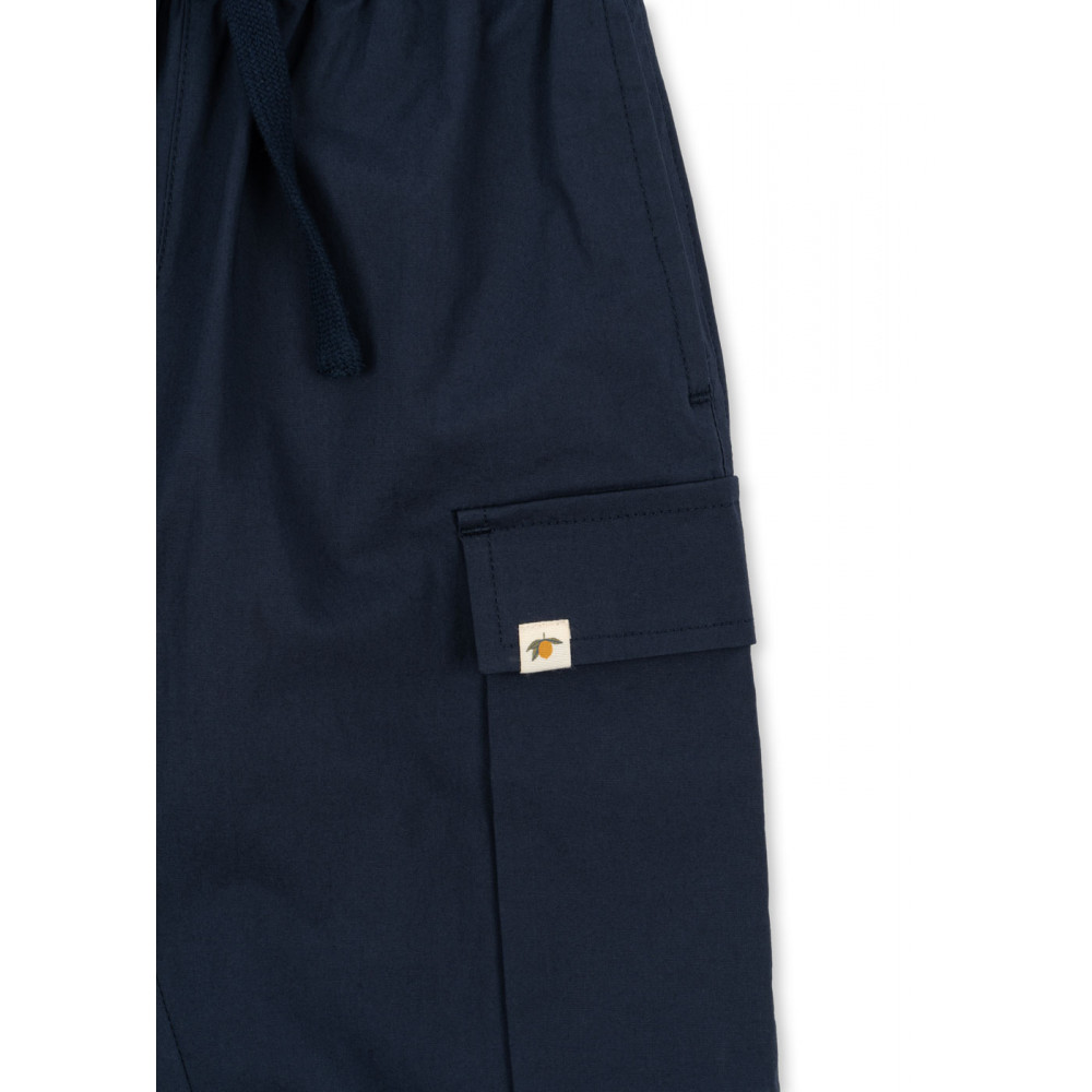 Crisp cotton poplin pants with a flexible drawstring waist. Designed in a classic cargo pant style with side pockets.