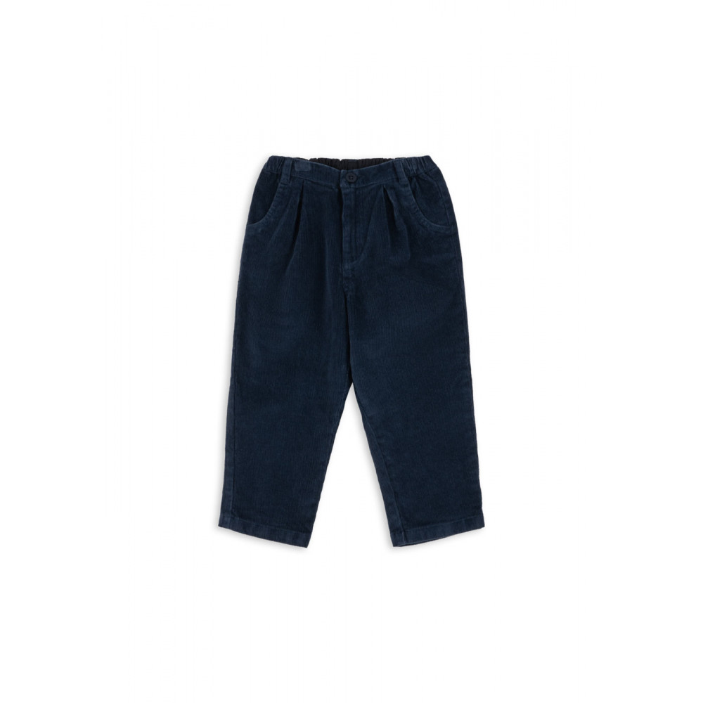 Soft corduroy pants with straight legs and a partially elastic waistband.
