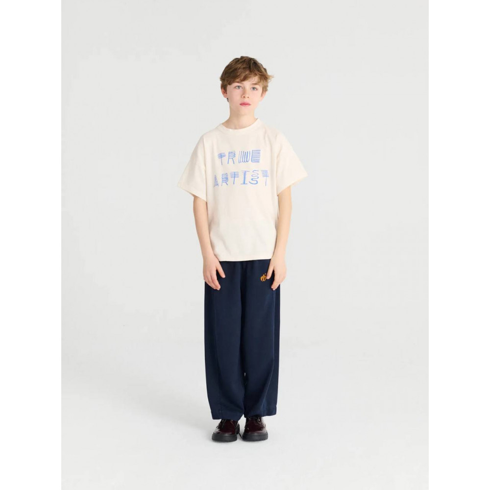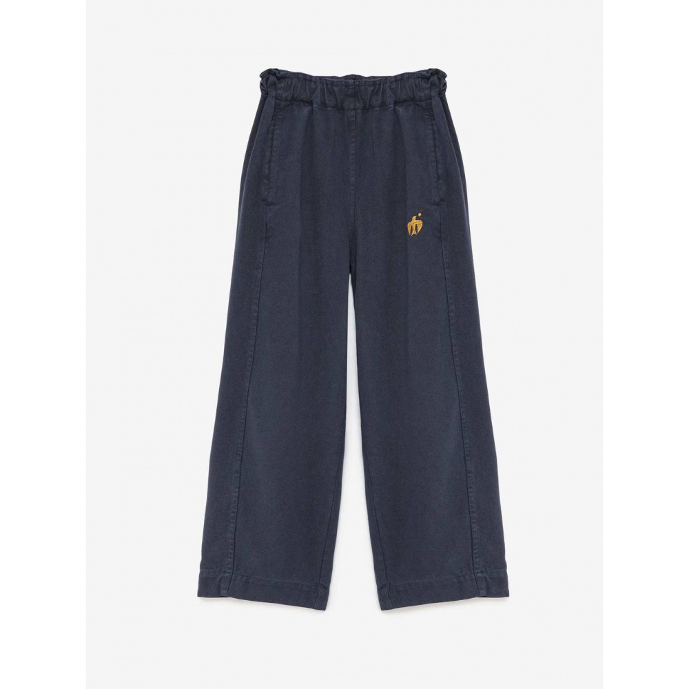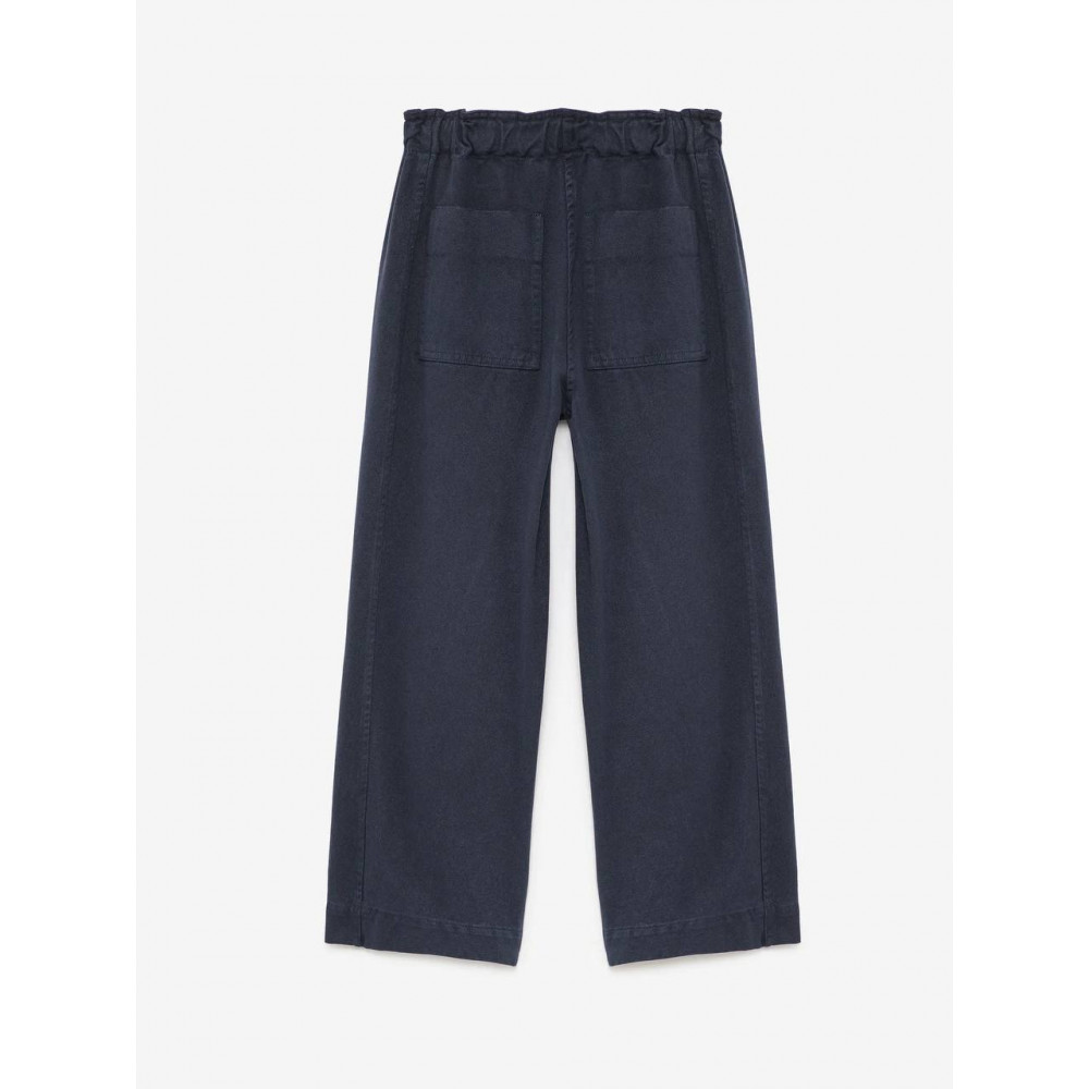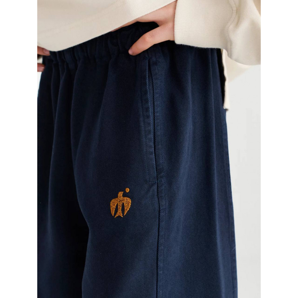 Trousers nº13 in Navy Blue are made of 70% cotton and 30% recycled cotton. They are designed with an elasticated, ruffled paperbag waist for a comfortable and adjustable fit. They have side pockets and they feature an embroidery of our bird logo in contrast color on the upper right thigh. They have a straight fit. Made in Spain