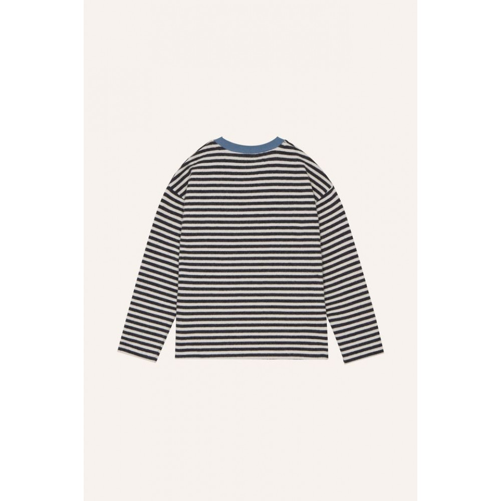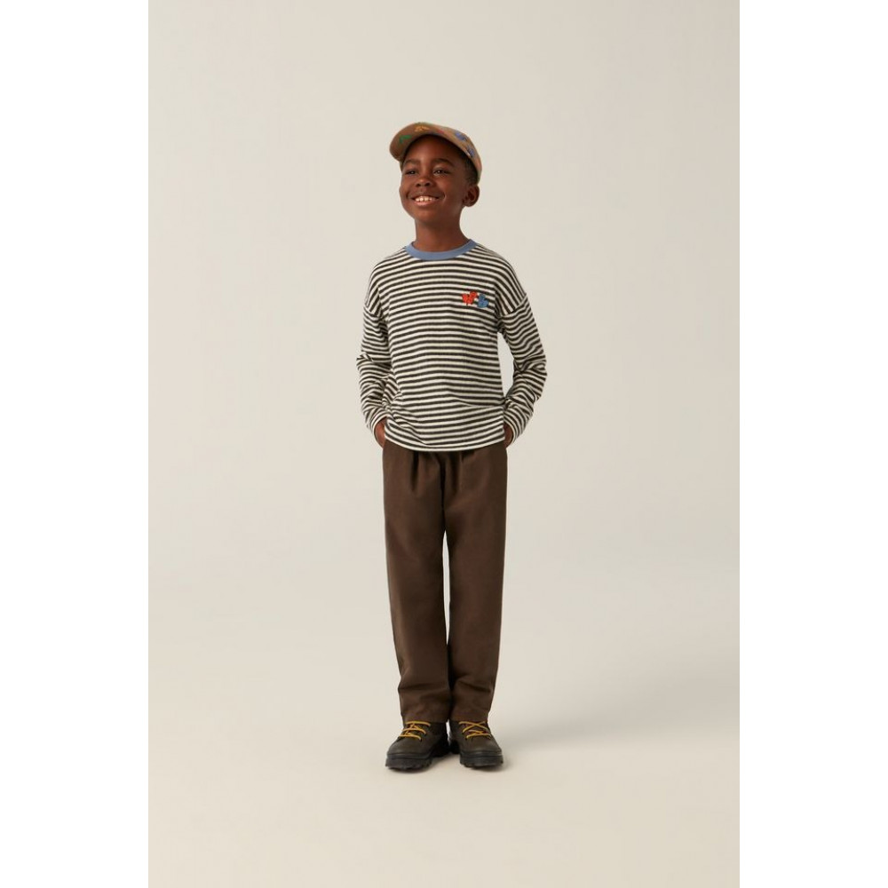 With oversized fit, this grey and ecru striped t-shirt is the perfect garment to complete any winter outfit. It has a cute squirrel embroidered on the chest. Long sleeves and rounded neck with rib for more comfort. Tshirt with long sleeves and oversized fit. Rounded neck with rib quality for added comfort. Made in Portugal.