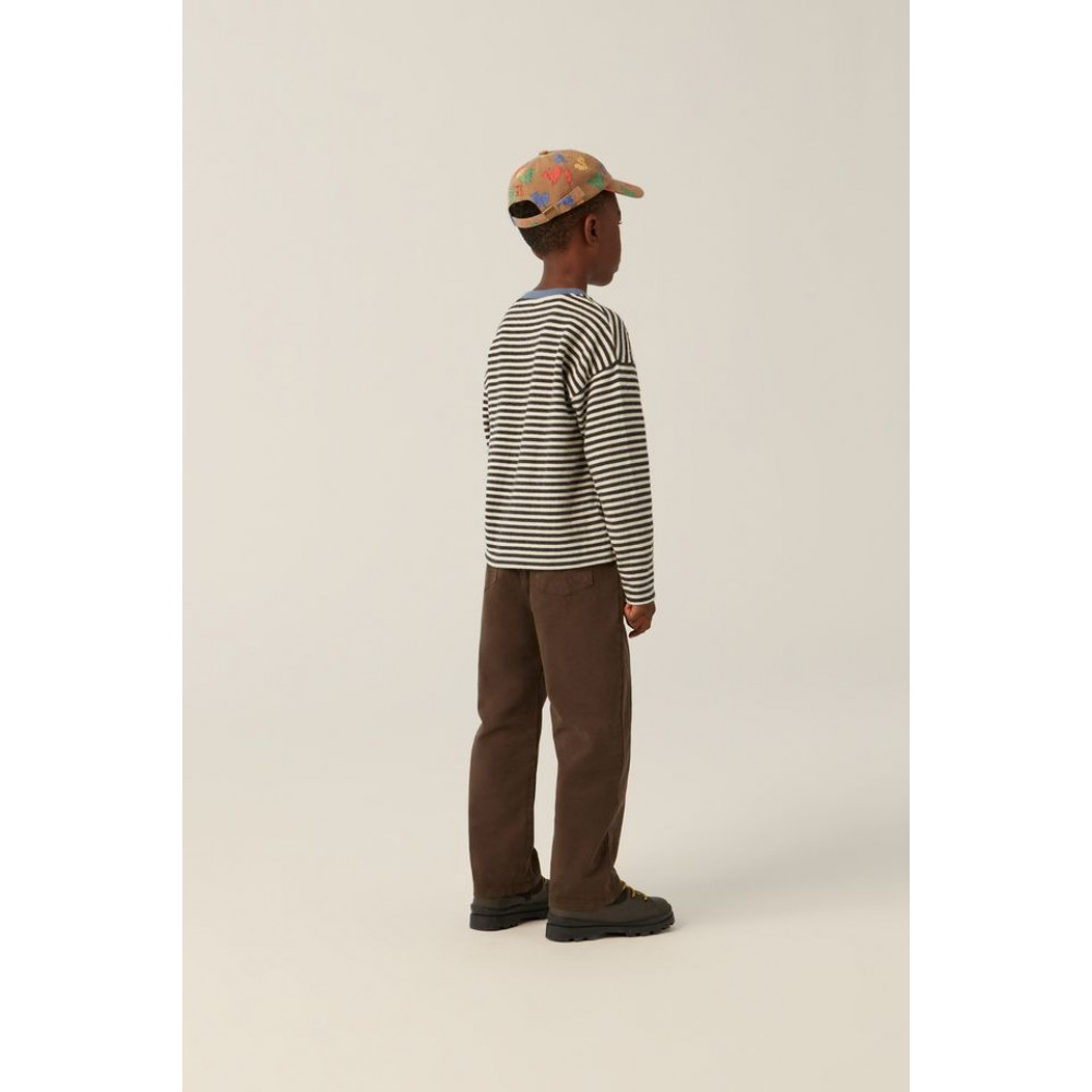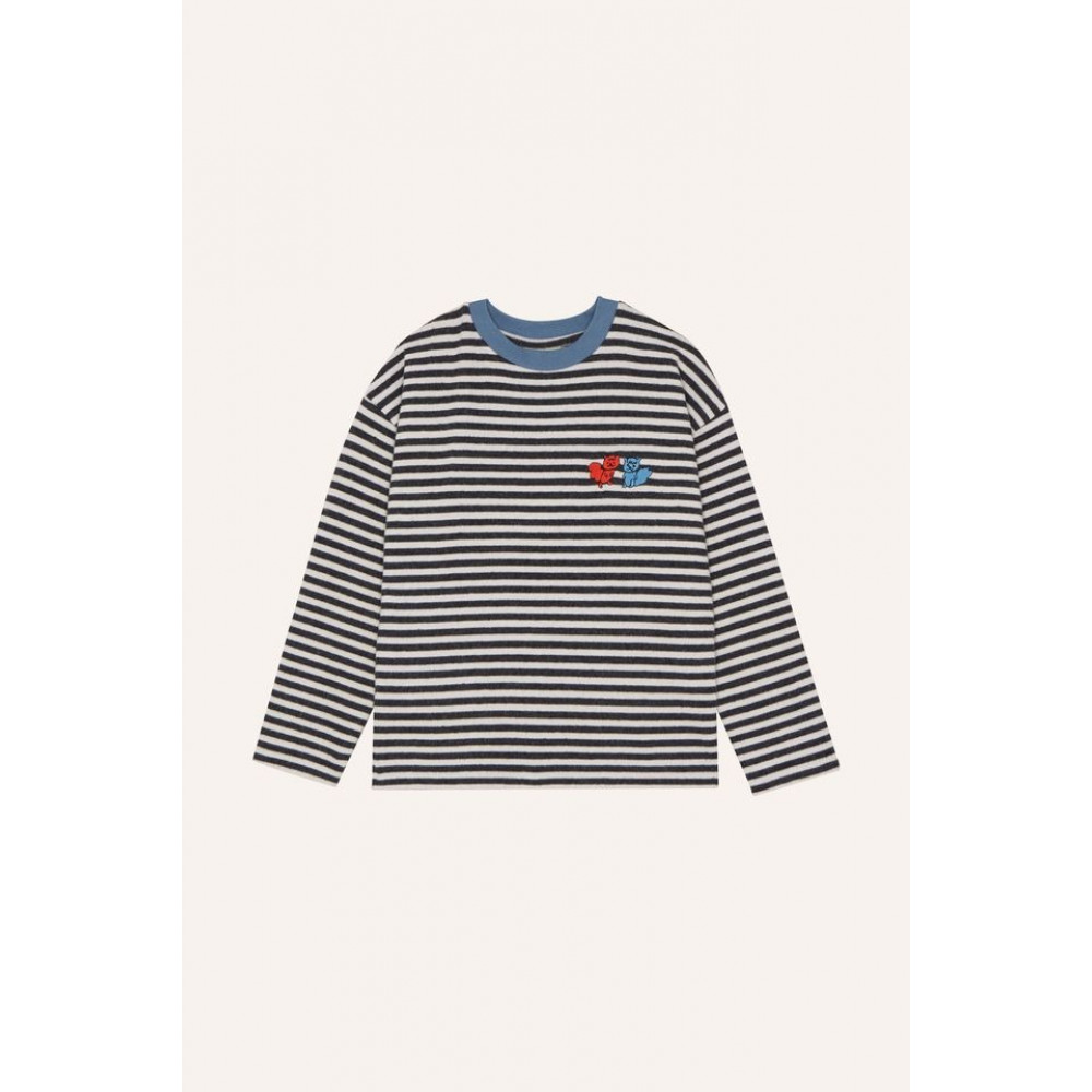 With oversized fit, this grey and ecru striped t-shirt is the perfect garment to complete any winter outfit. It has a cute squirrel embroidered on the chest. Long sleeves and rounded neck with rib for more comfort. Tshirt with long sleeves and oversized fit. Rounded neck with rib quality for added comfort. Made in Portugal.