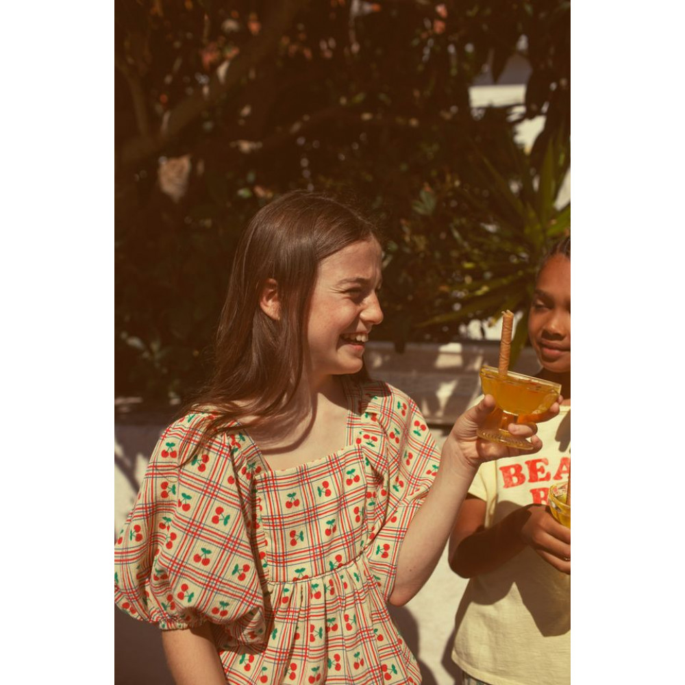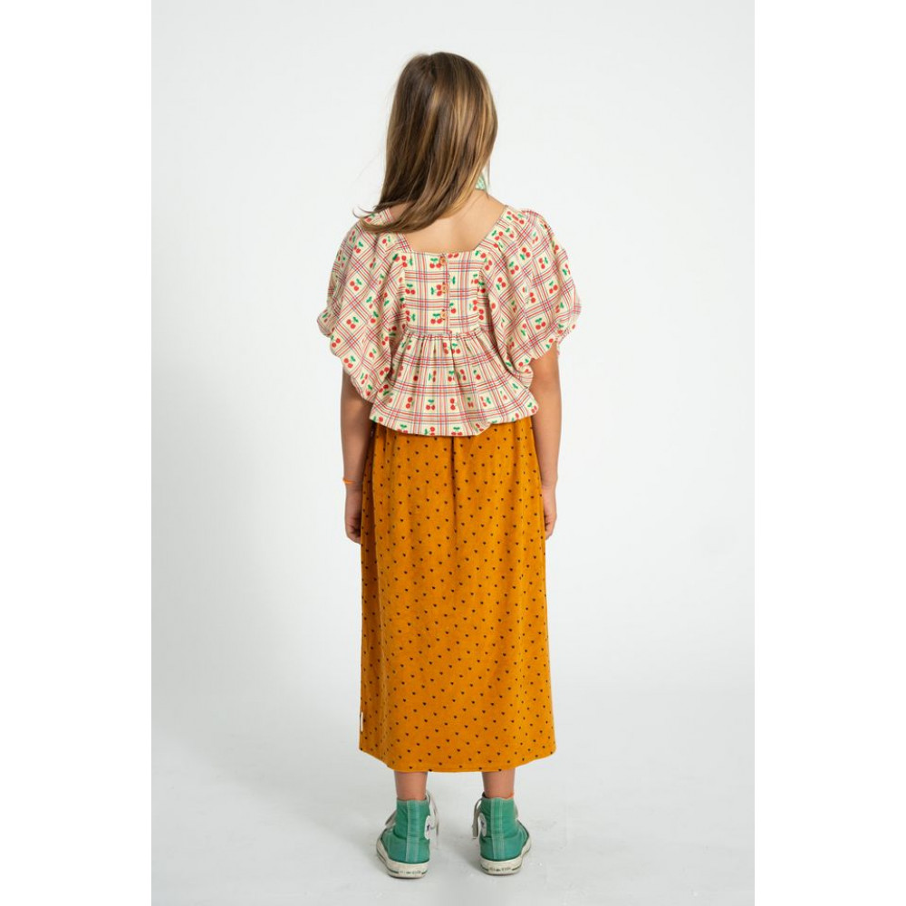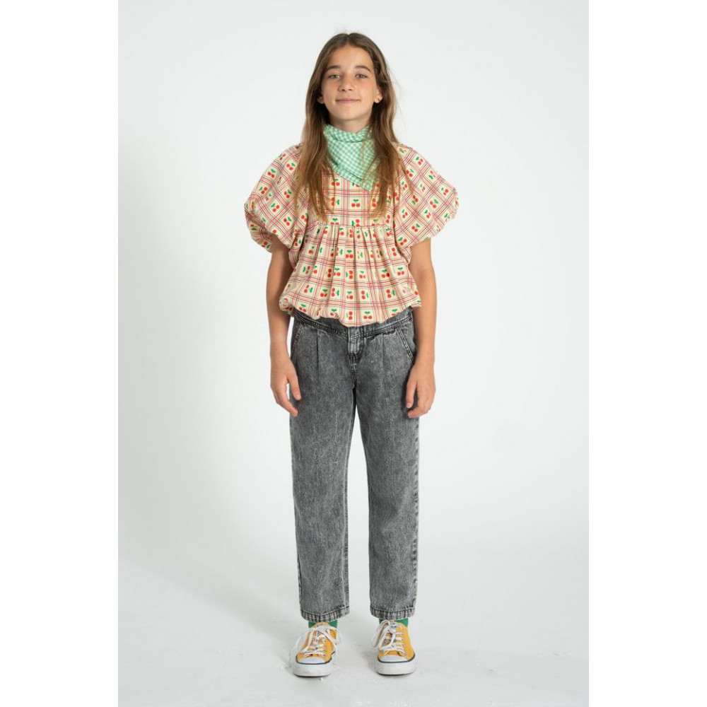 Cropped blouse with short ballon sleeves. Square neckline. Elastic hems. Back opening with small wood buttons. Wash cold (max 30ºC) . Do not bleach . Do not tumble dry . Iron medium (max 150°C) . Dry clean with any solvent except Trichloroethvlene .
