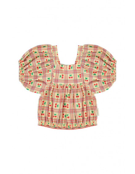 Cropped blouse with short ballon sleeves. Square neckline. Elastic hems. Back opening with small wood buttons. Wash cold (max 30ºC) . Do not bleach . Do not tumble dry . Iron medium (max 150°C) . Dry clean with any solvent except Trichloroethvlene .