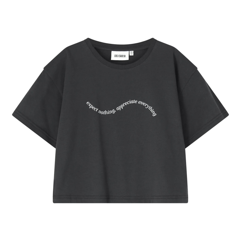 Chic meets mindful in this black caviar cropped tee with a wavy, eye-catching script that reads "Expect nothing, appreciate everything." A daily reminder wrapped in soft fabric and effortless cool—this tee brings both meaning and modern edge to her wardrobe.