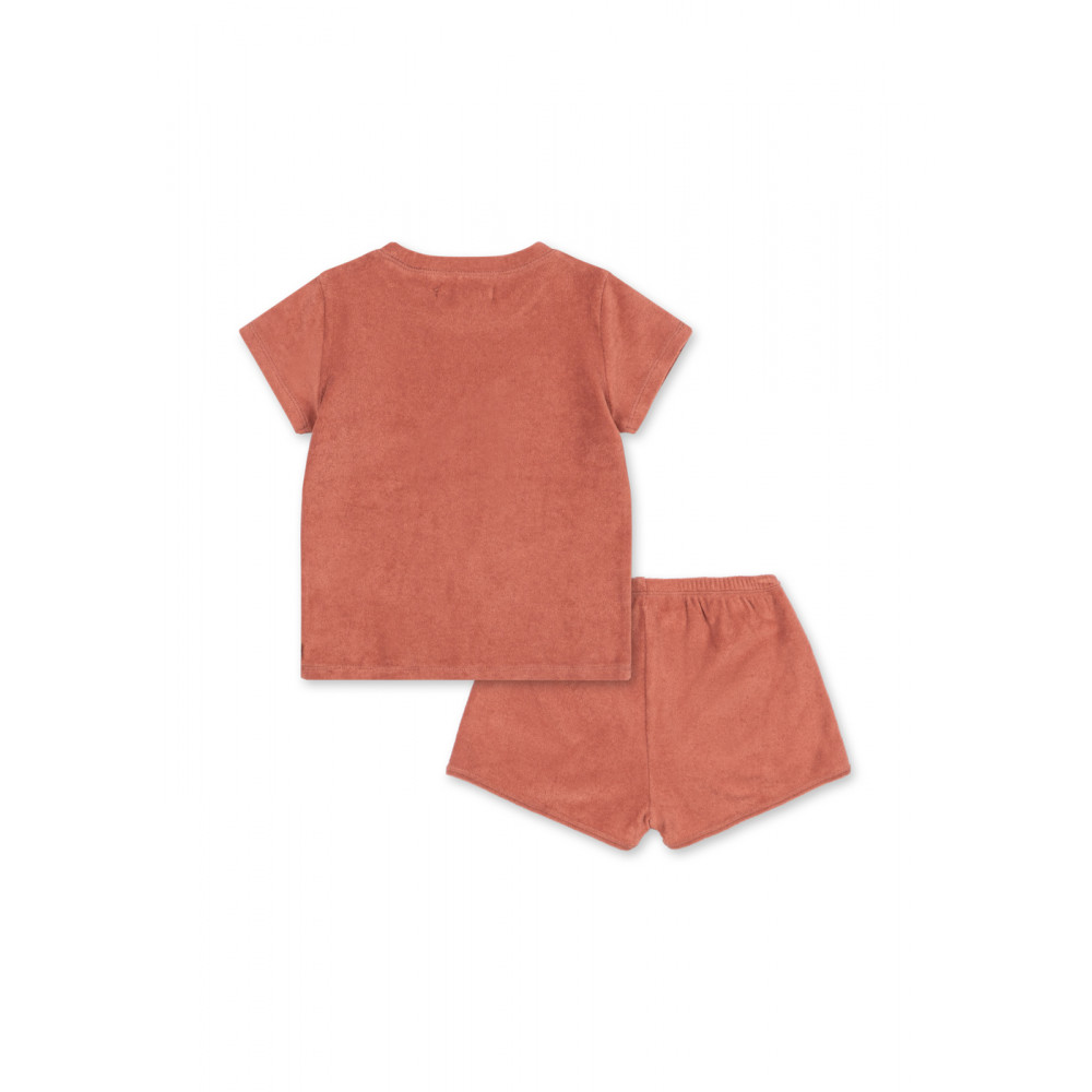 Soft two-piece set with a tee and shorts. Made from organic cotton terry with a fluffy texture, this set is made for warm summer days. The tee has a classic crewneck and a straight fit, and the shorts are designed with an elastic waistband and a short mid-thigh length.