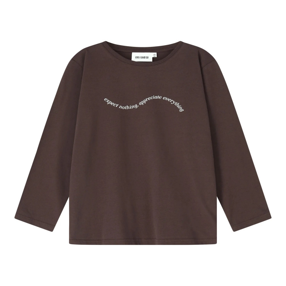 A cozy and thoughtful kids' longsleeve in a rich chocolate brown, featuring the inspiring quote "Expect Nothing, Appreciate Everything" on the front. Made for little ones with a big heart and a mindful spirit, crafted from soft, durable fabric for all-day comfort.