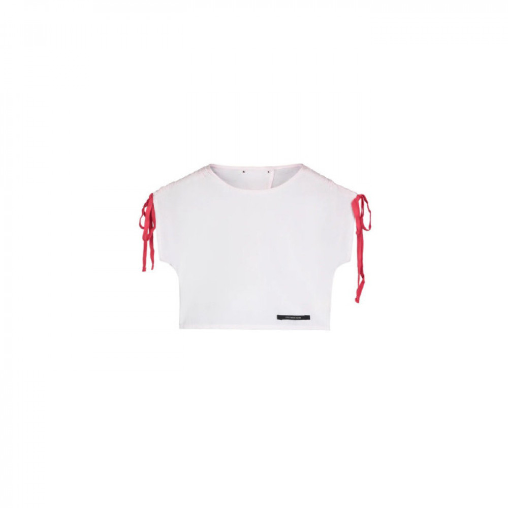 Cotton top. Lovely fuchsia bow embellishments on each sleeve. Back crossed buttoned closure. A well made garment.