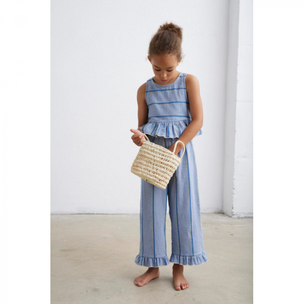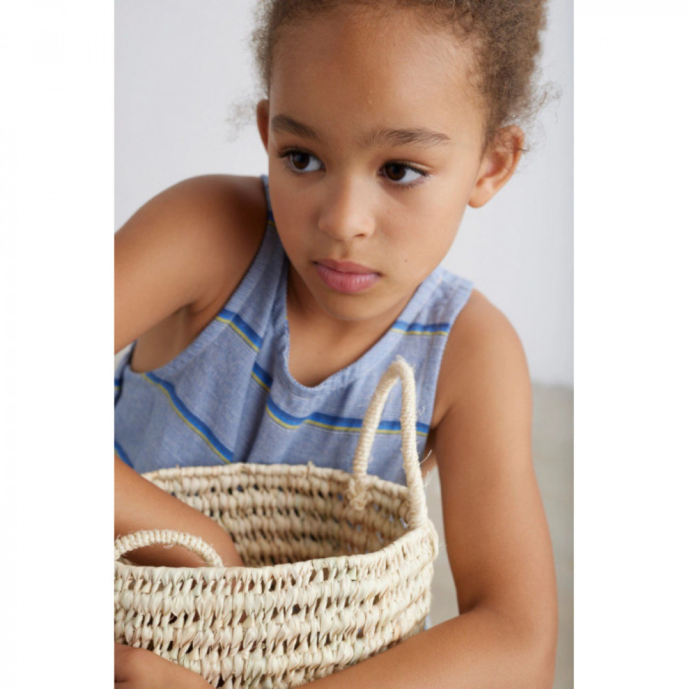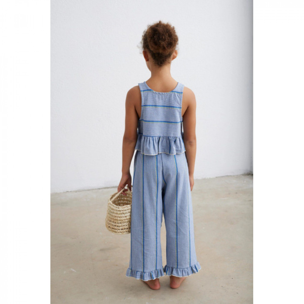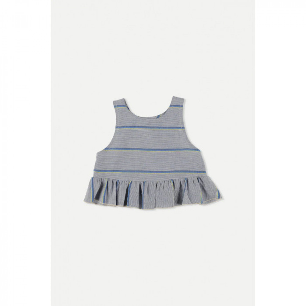 Button, dropped shoulders, and long sleeves. Side slits. Straight hem, longer at the back. Denim effect.
