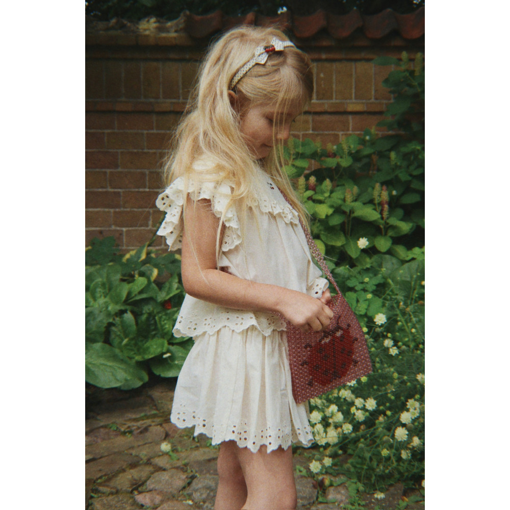 The Posey Top is a soft summer piece made from light and breathable cotton. The top is designed with romantic broderie anglaise detailing shaped like little cherries along the hem lines, adding the perfect finishing touch. Features a full mother of pearl button opening in the back.