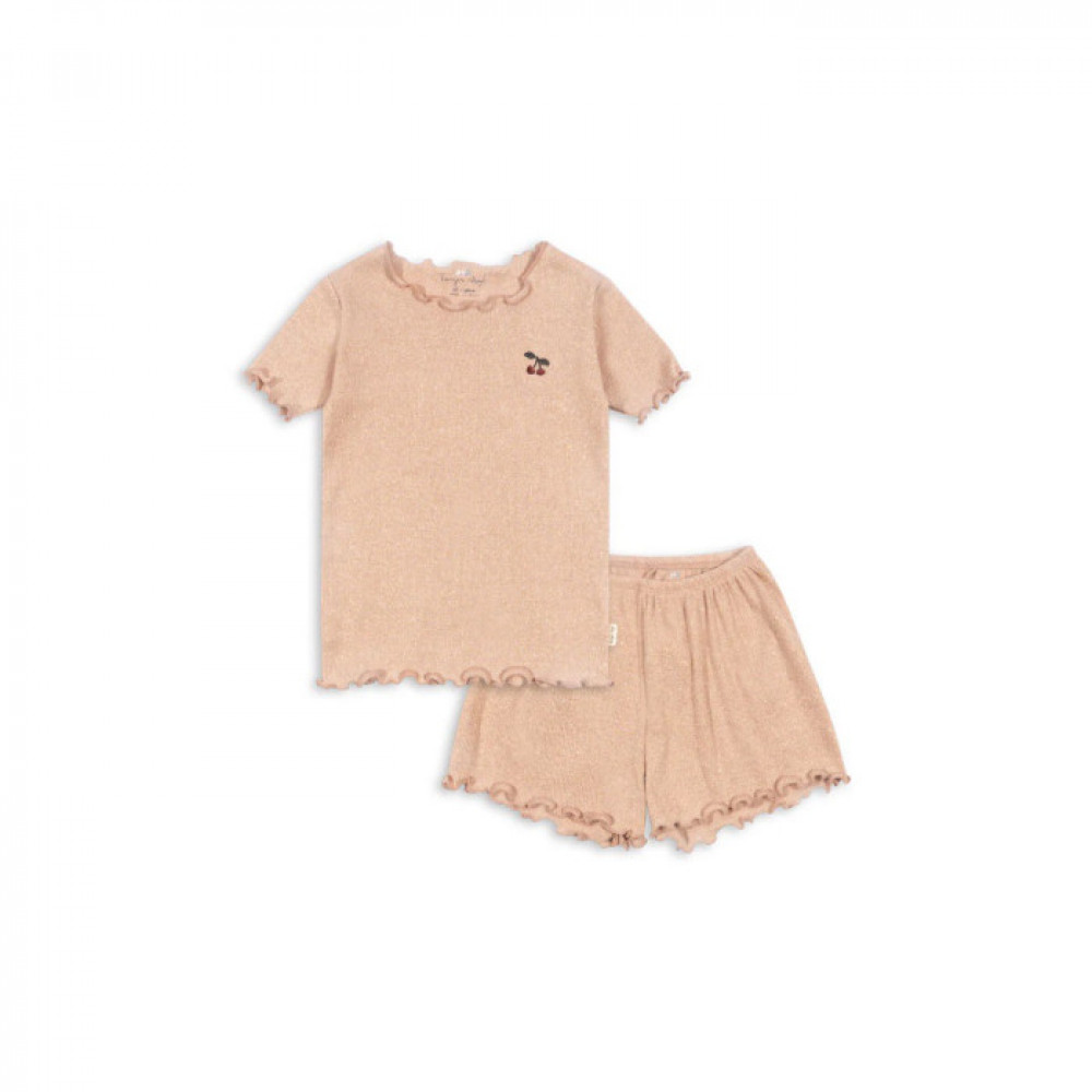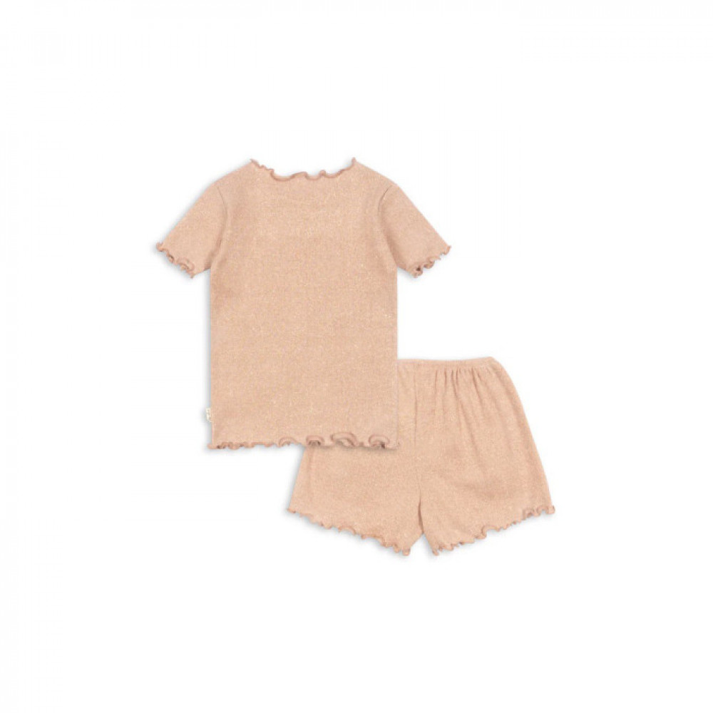 Two-piece set with short-sleeved blouse and shorts made in a stretchy, shimmery fabric.
