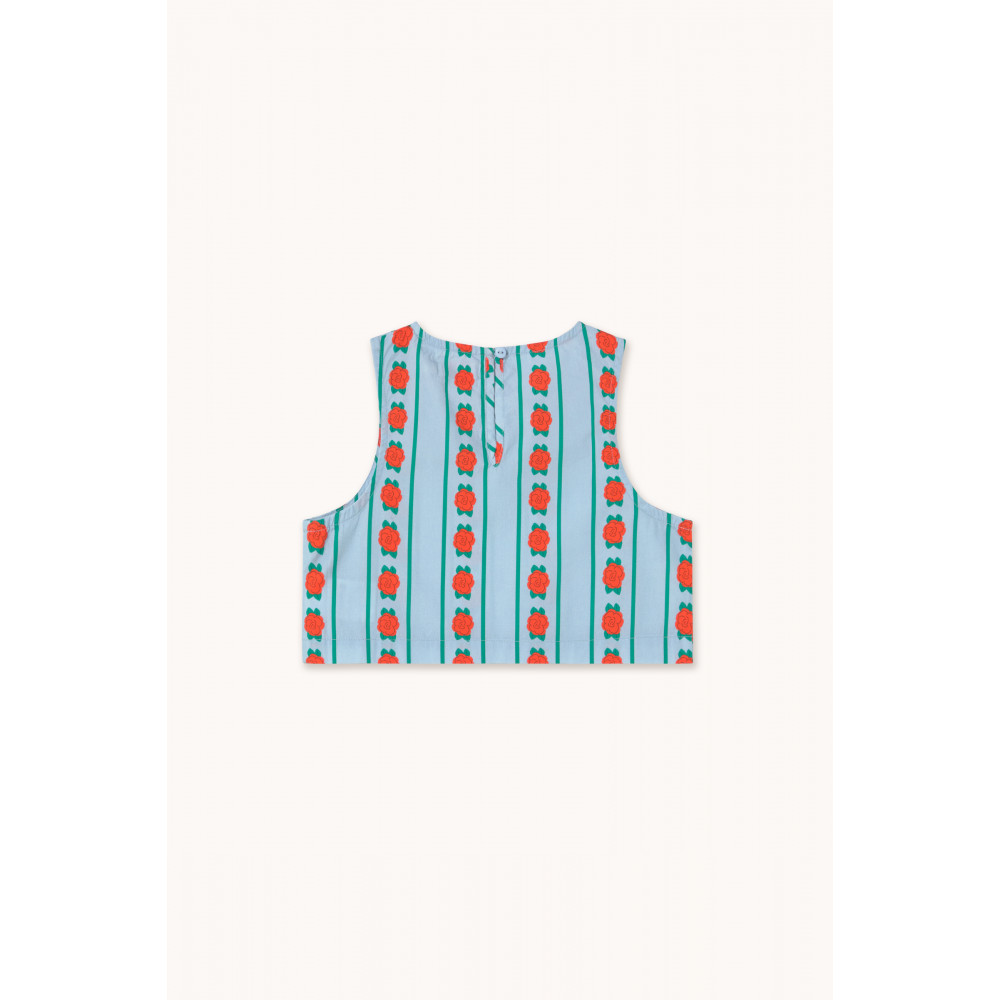 This short top with a Rose Pattern on a washed blue base combines simplicity and style in a fresh, summery design. Sleeveless with a round neckline, it features a small back keyhole with a button closure for easy dressing. Perfect for a laid-back look full of personality.