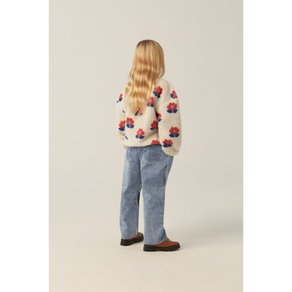 This jacket is the perfect garment to complete the winter looks and stay warm on the coldest days. In ecru teddy with red big flowers all over it. Loose fitting, open in the front with snaps. Made in Portugal