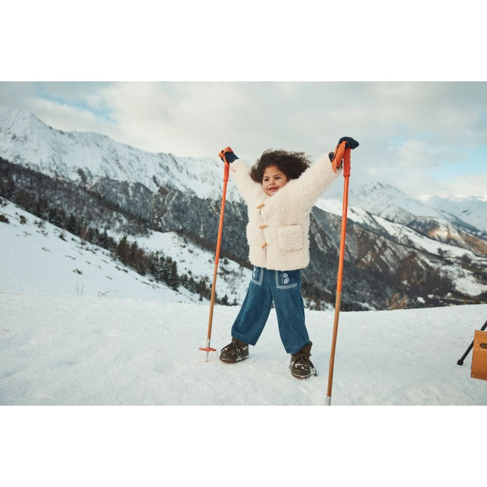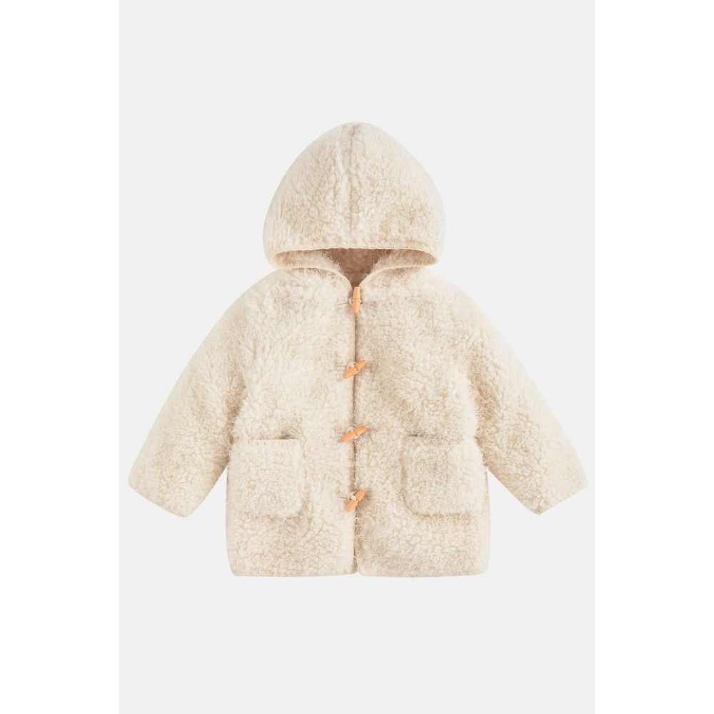 Sherpa coat. High collar. Top to top bottom front button placket. Lined.