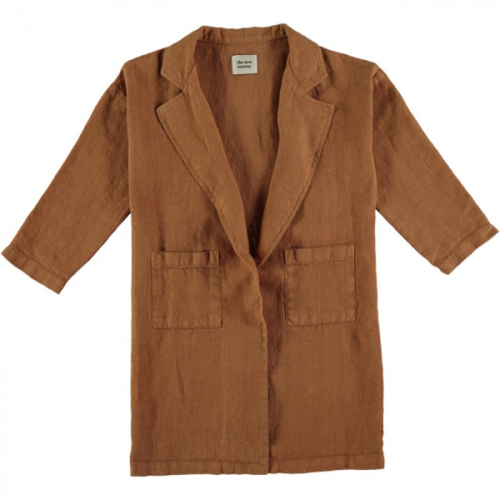 Stylish, long latte-coloured jacket crafted from fine woven linen.